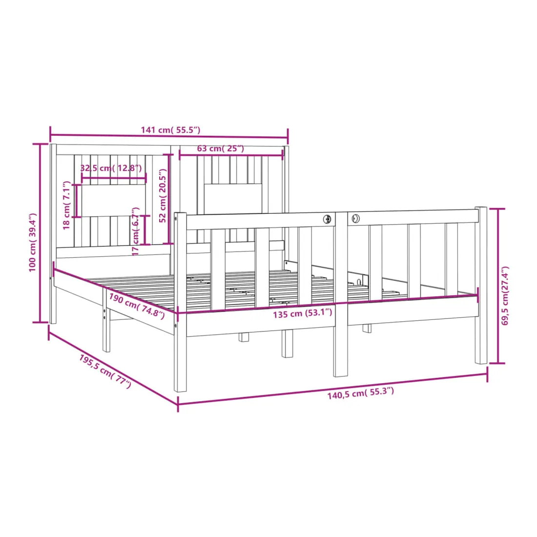 - Dimensions totales du cadre de lit : 195,5 x 141 x 100 cm (L x l x H)