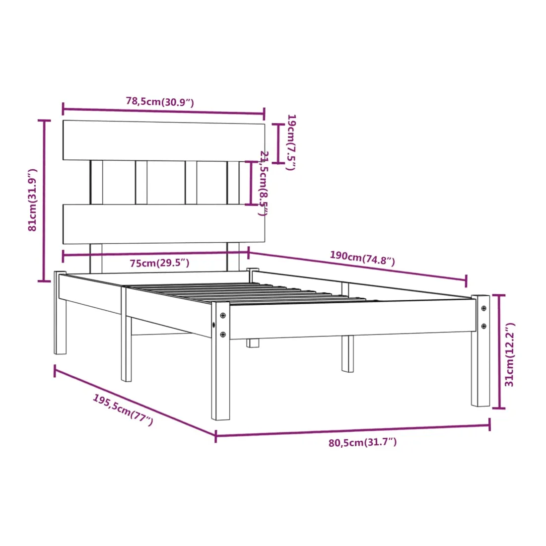 • Dimensions du cadre de lit : 195,5 x 80,5 x 31 cm (L x l x H)