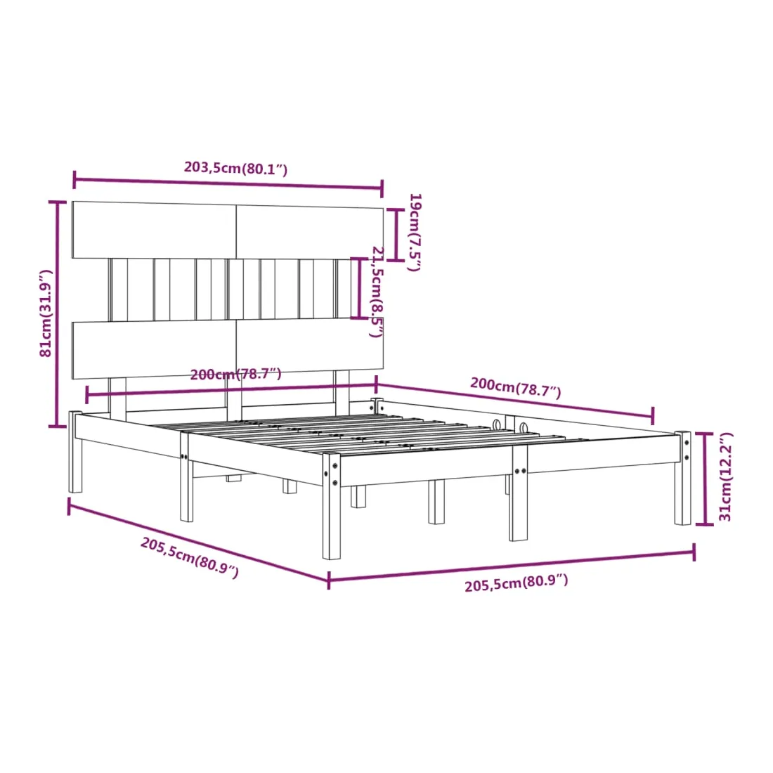 - Dimensions du cadre du lit : 205,5 x 205,5 x 31 cm (L x l x H)