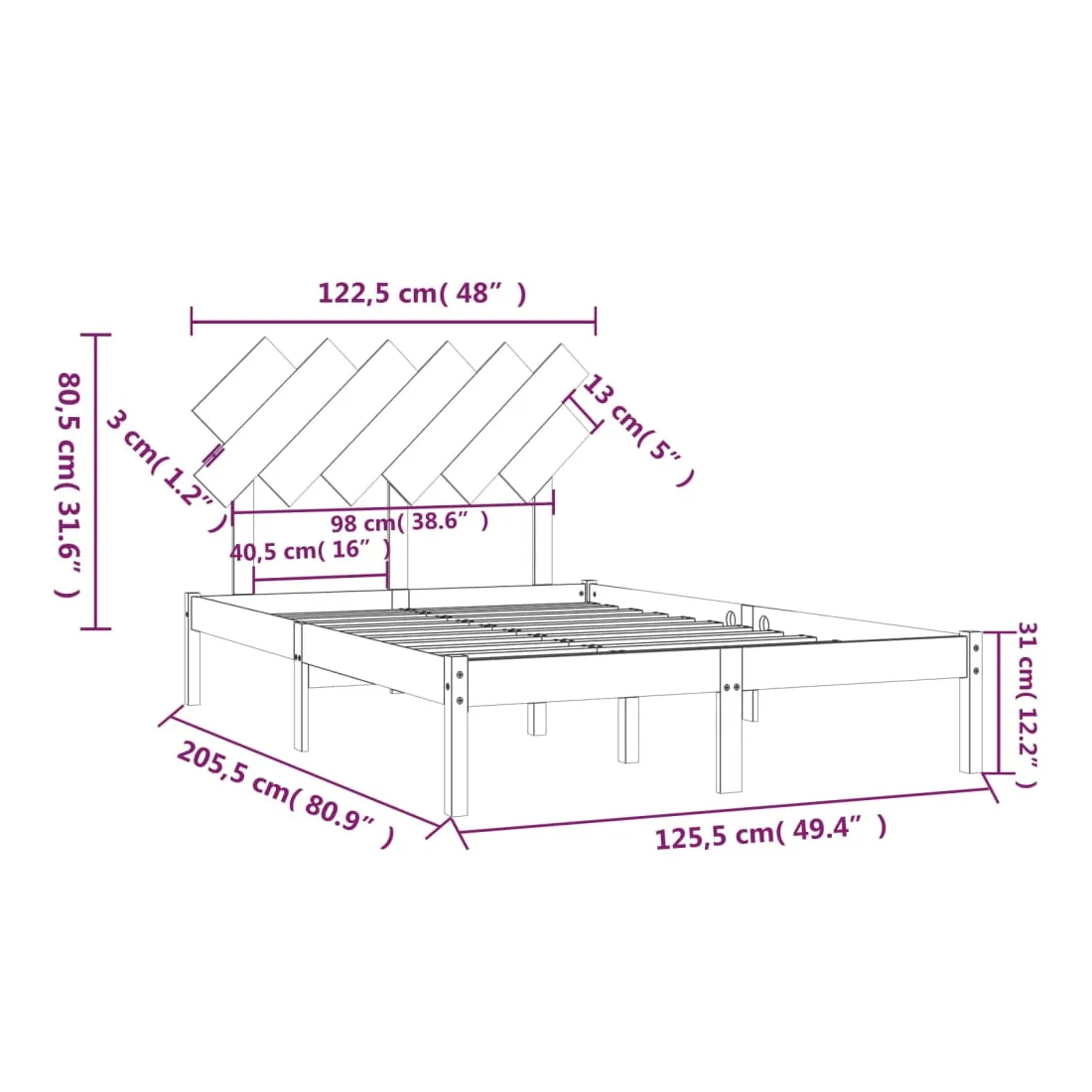 - Dimensions du cadre de lit : 205,5 x 125,5 x 31 cm (L x l x H)