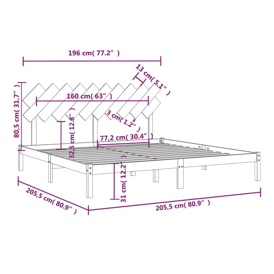 • Dimensions du cadre du lit : 205,5 x 205,5 x 31 cm (L x l x H)