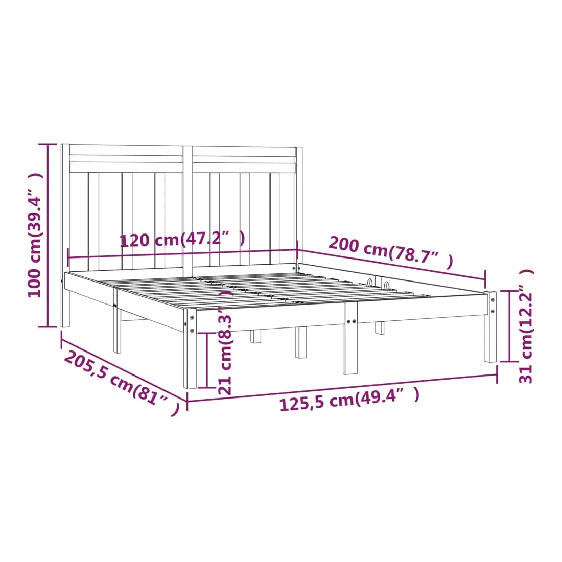 - Dimensions du cadre de lit : 205,5 x 125,5 x 31 cm (L x l x H)