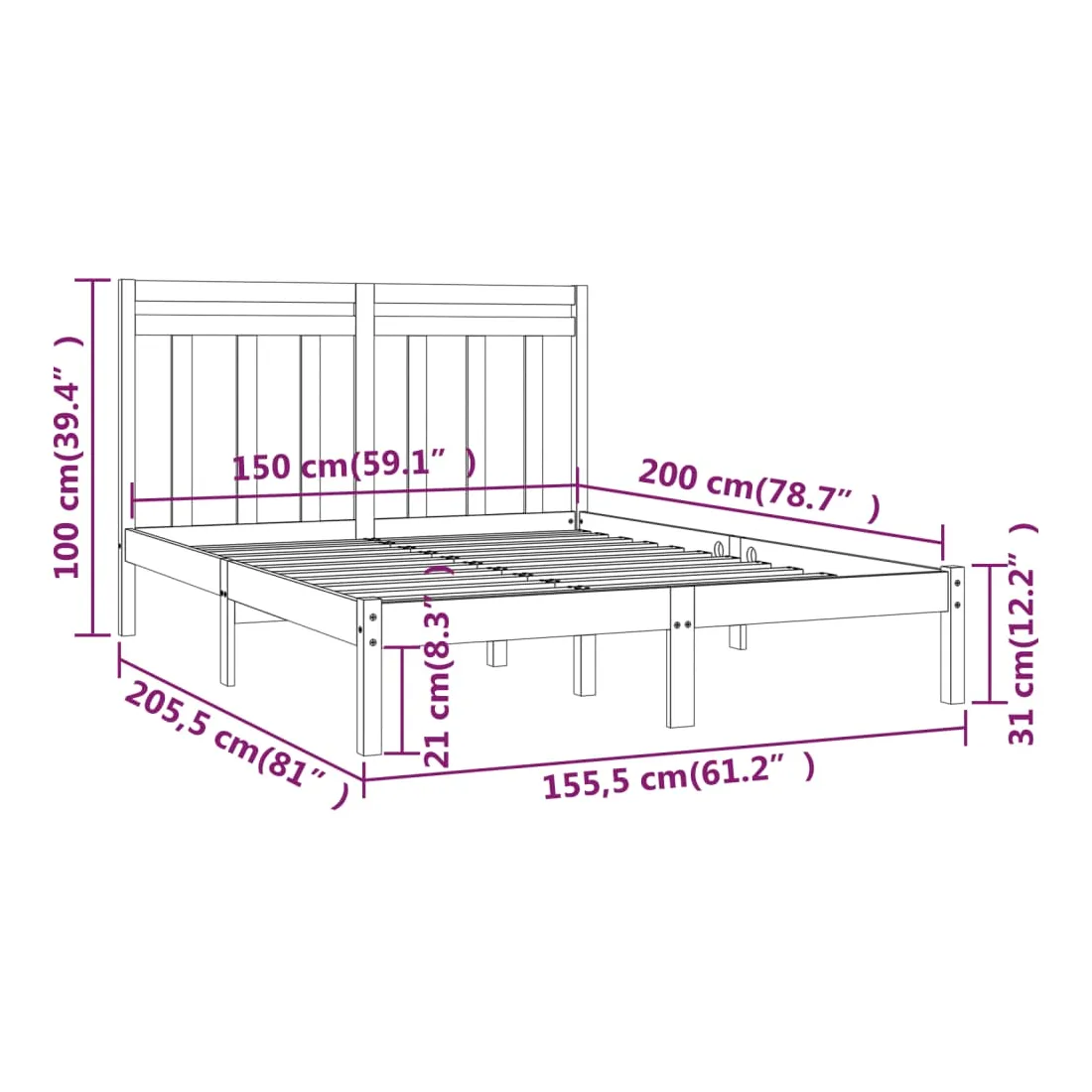 • Dimensions du cadre de lit : 205,5 x 155,5 x 31 cm (L x l x H)