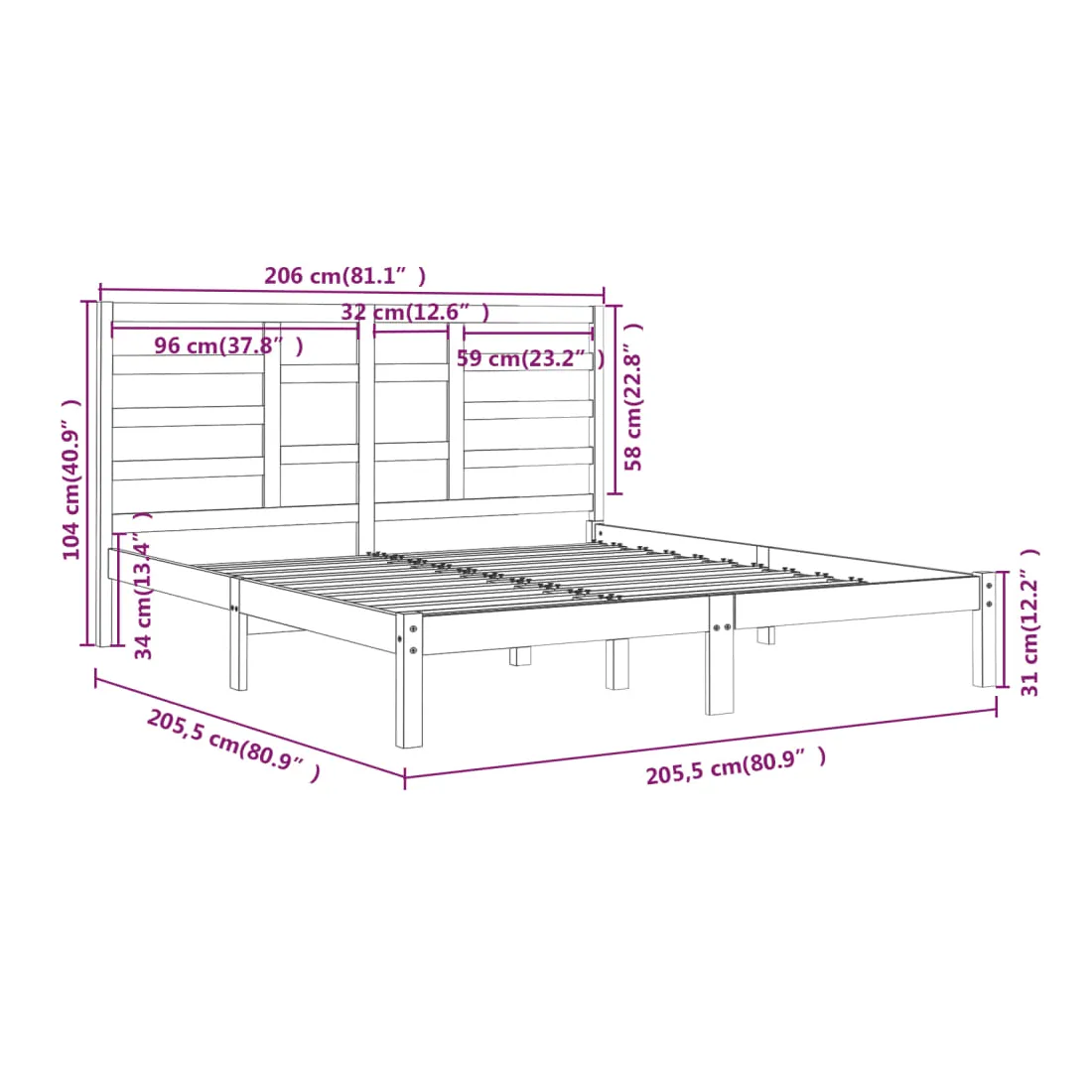 • Dimensions de la tête de lit : 206 x 4 x 104 cm (l x P x H)