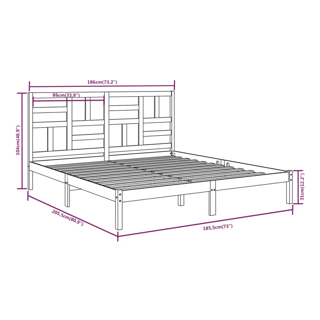 - Dimensions de la tête de lit : 186 x 4 x 104 cm (l x P x H)