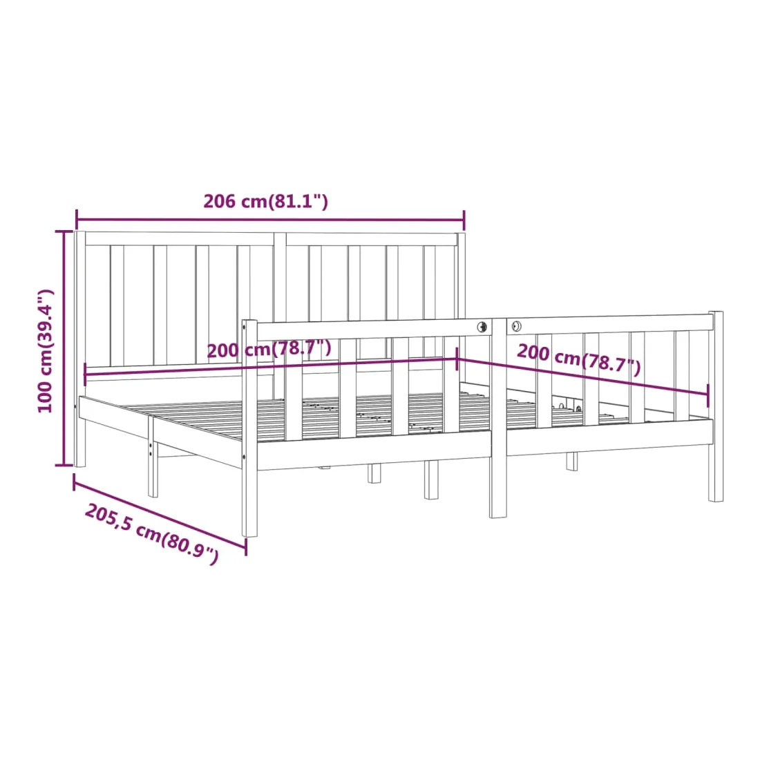 • Dimensions totales du cadre de lit : 206 x 205,5 x 100 cm (L x l x H)