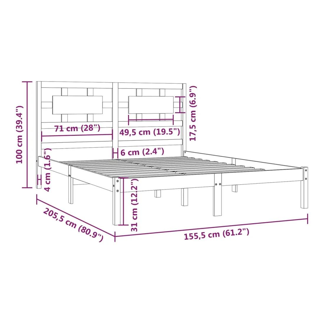 • Dimensions du cadre de lit : 205,5 x 155,5 x 31 cm (L x l x H)