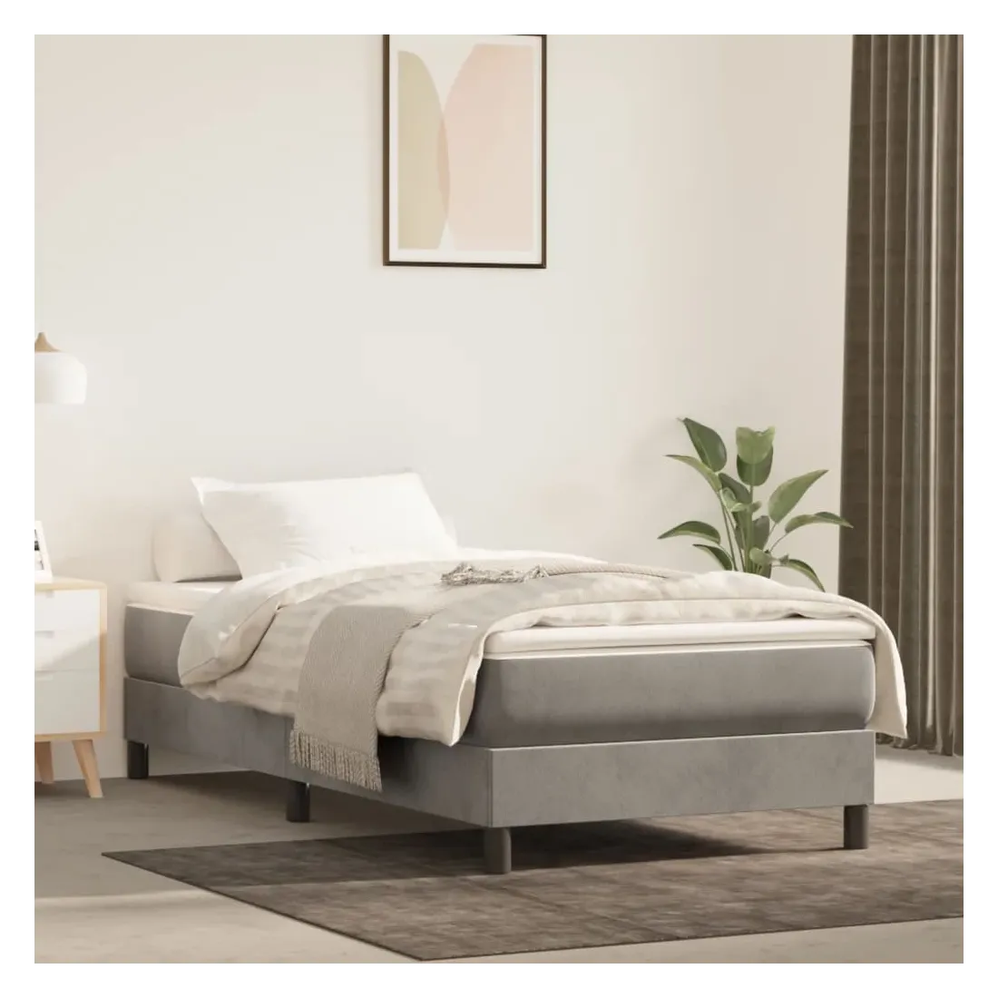 Obtenez une meilleure nuit de sommeil reposante grâce à ce cadre de lit à ressorts ! Il est un supplément accueillant à toute chambre à coucher. Velours doux : le velours est un tissu doux et luxueux qui se reconnaît à son tas dense de fibres uniformément coupées qui ont une touche lisse. Le tissu en velours présente un toucher doux distinctif, ce qui le rend confortable au toucher.Pieds de soutien : le lit est soutenu par des pieds robustes, qui assurent sa stabilité, sa sécurité et sa fermeté.Lattes de contreplaqué : les lattes de contreplaqué assurent une bonne répartition du poids, garantissant que le matelas reste en place à chaque torsion de votre corps pendant le sommeil. Bon à savoir :Un matelas n'est pas inclus avec ce lit. Nous offrons une sélection variée de matelas. Vous pouvez consulter notre boutique pour trouver un matelas assorti.