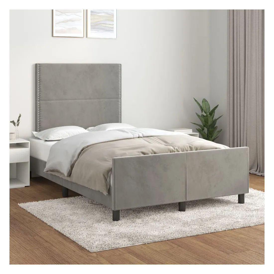 Obtenez une meilleure nuit de sommeil reposante grâce à ce cadre de lit avec tête de lit ! Il est un supplément accueillant à toute chambre à coucher. Velours doux : le velours est un tissu doux et luxueux qui se reconnaît à son tas dense de fibres uniformément coupées qui ont une touche lisse. Le tissu en velours présente un toucher doux distinctif, ce qui le rend confortable au toucher.Hauteur réglable : la tête de lit est réglable en hauteur selon vos préférences.Pieds de soutien : le lit est soutenu par des pieds robustes, qui assurent sa stabilité, sa sécurité et sa fermeté.Lattes de contreplaqué : les lattes de contreplaqué assurent une bonne répartition du poids, garantissant que le matelas reste en place à chaque torsion de votre corps pendant le sommeil.Excellent soutien : la tête de lit vous offre un excellent soutien du dos lorsque vous êtes assis dans votre lit pour lire ou regarder la télévision. Remarque :La livraison comprend uniquement un cadre de lit. Le matelas n'est pas inclus. Vous pouvez consulter notre boutique pour trouver les matelas assortis.Chaque produit est livré avec un manuel de montage dans la boîte pour un montage facile.