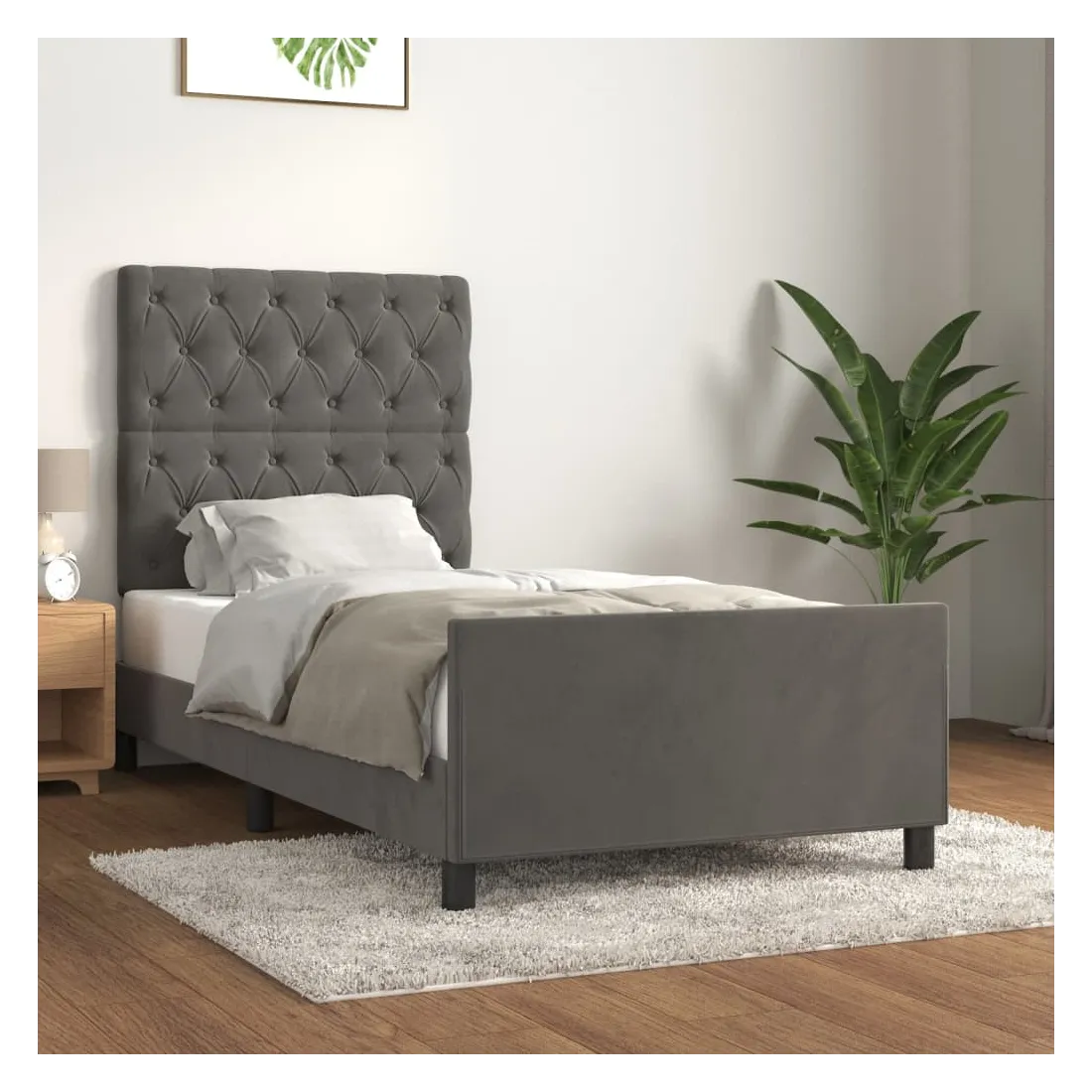 Obtenez une meilleure nuit de sommeil reposante grâce à ce cadre de lit avec tête de lit ! Il est un supplément accueillant à toute chambre à coucher. Velours doux : le velours est un tissu doux et luxueux qui se reconnaît à son tas dense de fibres uniformément coupées qui ont une touche lisse. Le tissu en velours présente un toucher doux distinctif, ce qui le rend confortable au toucher.Hauteur réglable : la tête de lit est réglable en hauteur selon vos préférences.Pieds de soutien : le lit est soutenu par des pieds robustes, qui assurent sa stabilité, sa sécurité et sa fermeté.Lattes de contreplaqué : les lattes de contreplaqué assurent une bonne répartition du poids, garantissant que le matelas reste en place à chaque torsion de votre corps pendant le sommeil.Excellent soutien : la tête de lit vous offre un excellent soutien du dos lorsque vous êtes assis dans votre lit pour lire ou regarder la télévision. Remarque :La livraison comprend uniquement un cadre de lit. Le matelas n'est pas inclus. Vous pouvez consulter notre boutique pour trouver les matelas assortis.Chaque produit est livré avec un manuel de montage dans la boîte pour un montage facile.