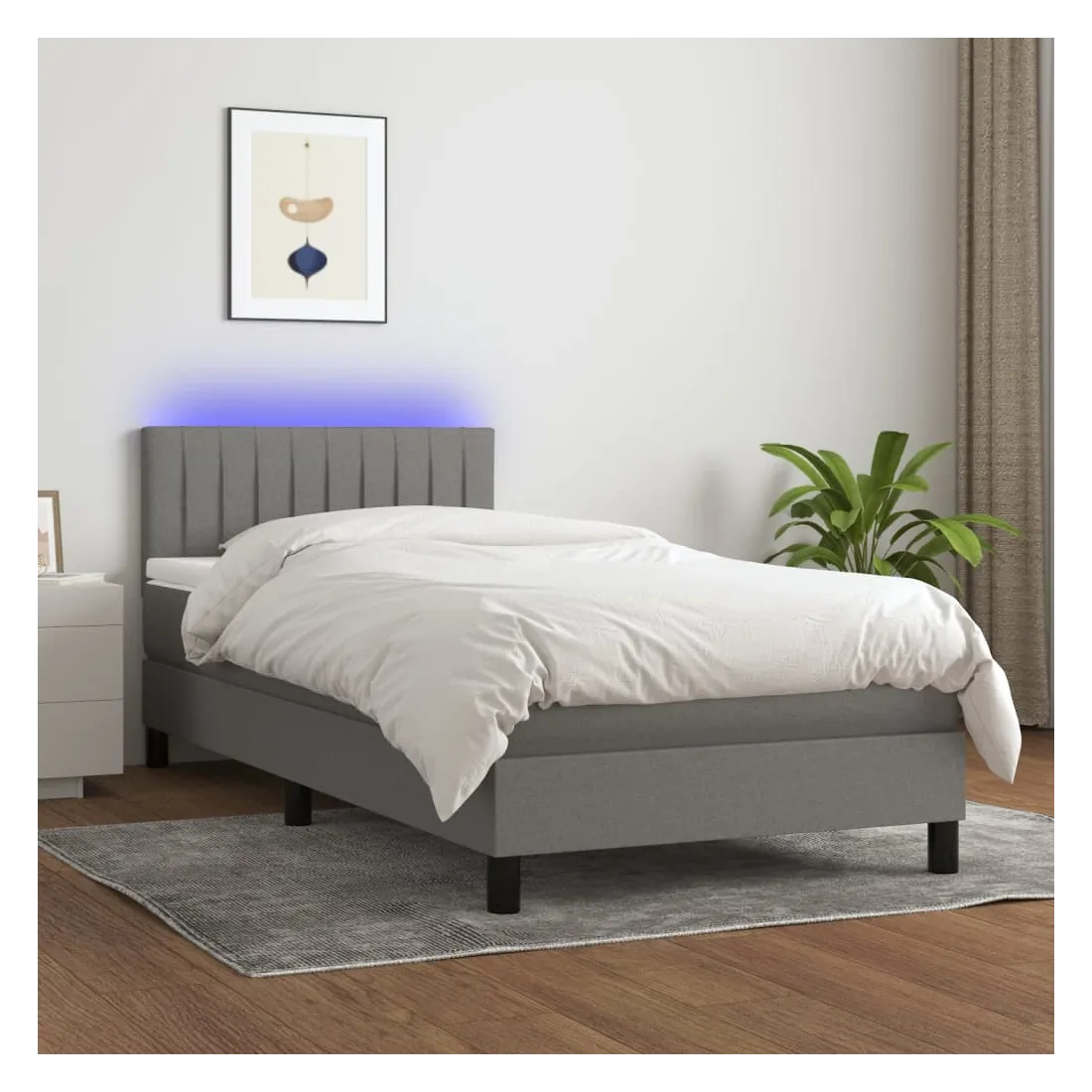 Utilisez ce sommier tapissier avec matelas et LED pour profiter d'un sommeil réparateur ! C'est le point central de votre chambre à coucher. Tissu durable : le tissu présente un aspect simple et épuré, et il est respirant et durable. Tête de lit pratique : la tête de lit est réglable en hauteur selon vos préférences. La tête de lit vous offre un excellent soutien du dos lorsque vous êtes assis dans votre lit pour lire ou regarder la télévision. Bande LED colorée : apportez de l'éclairage dans l'obscurité avec des lumières LED colorées ! Matelas à ressorts ensachés : le ressort ensaché individuel intégré est connu pour sa très haute qualité tout en assurant un haut niveau de durabilité et d'adaptabilité. Il peut absorber efficacement le bruit et les chocs causés par les sauts et les rot