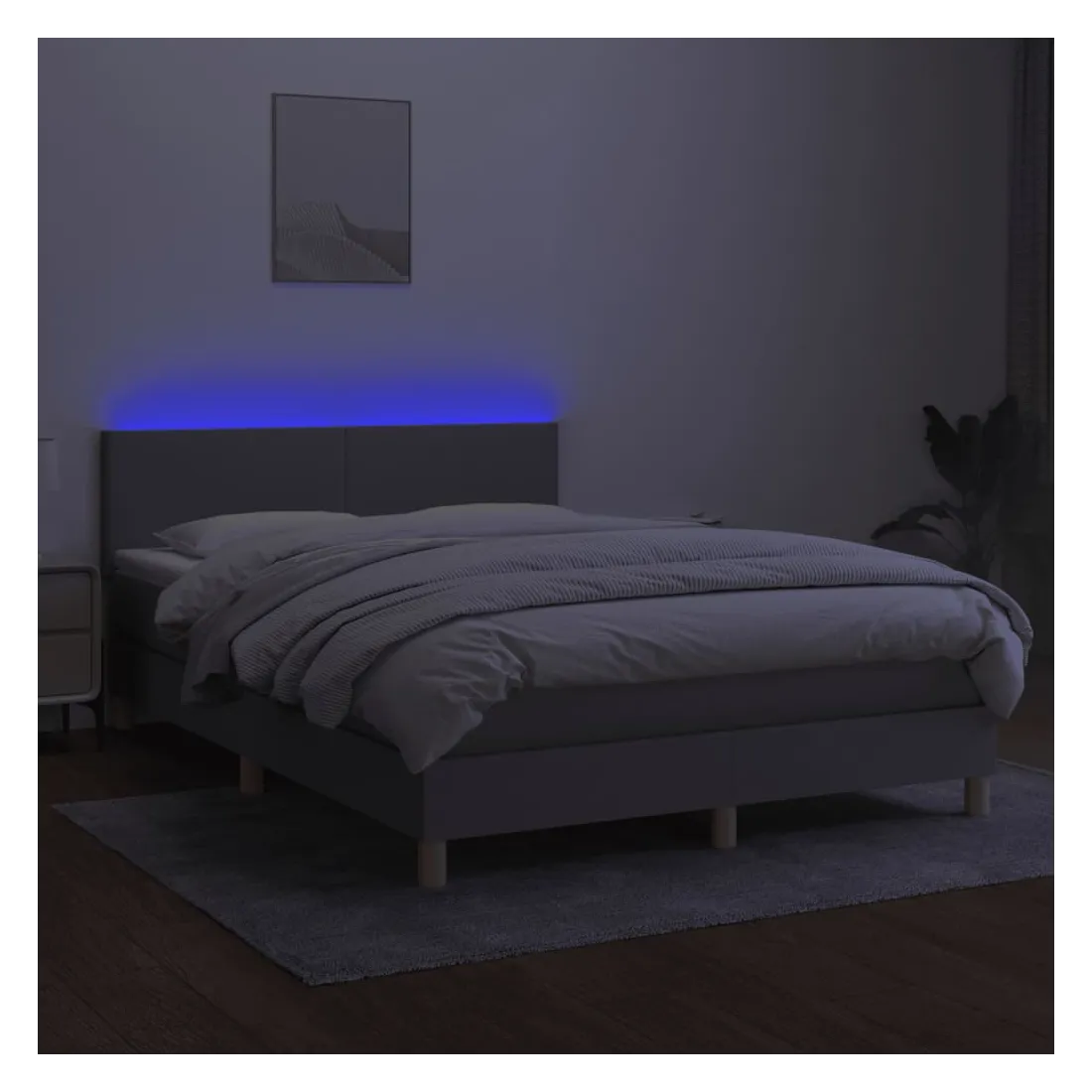 Utilisez ce sommier tapissier avec matelas et LED pour profiter d'un sommeil réparateur ! C'est le point central de votre chambre à coucher. Tissu durable : le tissu présente un aspect simple et épuré, et il est respirant et durable. Tête de lit pratique : la tête de lit est réglable en hauteur selon vos préférences. La tête de lit vous offre un excellent soutien du dos lorsque vous êtes assis dans votre lit pour lire ou regarder la télévision. Bande LED colorée : apportez de l'éclairage dans l'obscurité avec des lumières LED colorées ! Matelas à ressorts ensachés : le ressort ensaché individuel intégré est connu pour sa très haute qualité tout en assurant un haut niveau de durabilité et d'adaptabilité. Il peut absorber efficacement le bruit et les chocs causés par les sauts et les rot