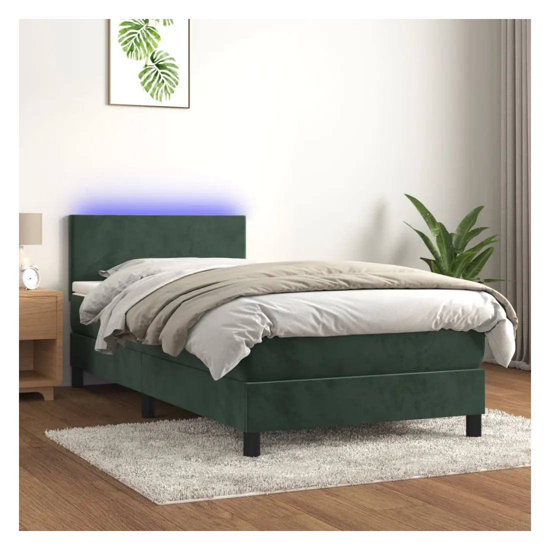 Utilisez ce sommier tapissier avec matelas et LED pour profiter d'un sommeil réparateur ! C'est le point central de votre chambre à coucher. Velours doux : le velours est un tissu doux et luxueux qui se reconnaît à son tas dense de fibres uniformément coupées qui ont une touche lisse. Le tissu en velours présente un toucher doux distinctif, ce qui le rend confortable au toucher.Tête de lit pratique : la tête de lit est réglable en hauteur selon vos préférences. La tête de lit vous offre un excellent soutien du dos lorsque vous êtes assis dans votre lit pour lire ou regarder la télévision.Bande LED colorée : apportez de l'éclairage dans l'obscurité avec des lumières LED colorées !Matelas à ressorts ensachés : le ressort ensaché individuel intégré est connu pour sa très haute qualité tout en assurant un haut niveau de durabilité et d'adaptabilité. Il peut absorber efficacement le bruit et les chocs causés par les sauts et les rotations.Protège-matelas doux pour la peau : le protège-matelas est recouvert d'un tissu résistant et doux pour la peau, ce qui le rend souple et confortable. Remarque :Pour des raisons d'hygiène, le matelas ne peut pas être retourné si l'emballage est retiré ou ouvert.Chaque produit est livré avec un manuel de montage dans la boîte pour un montage facile.Seule la partie avec un symbole de ciseaux peut être coupée et seule la partie avec l'USB continuera à fonctionner comme avant.Ce produit est doté d'un connecteur USB, mais la source d'alimentation certifiée de USB 5V n'est pas incluse.