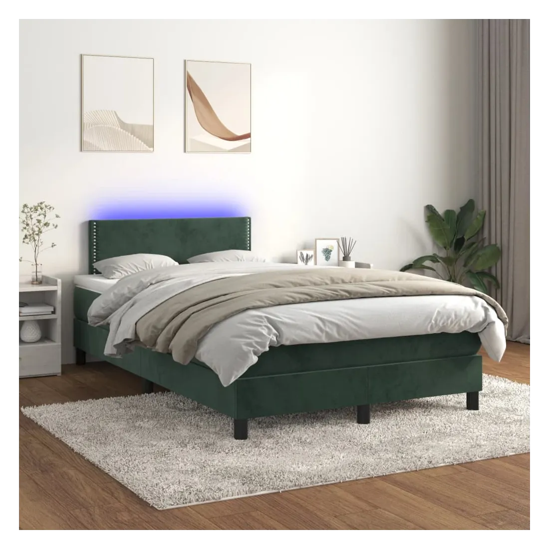 Utilisez ce sommier tapissier avec matelas et LED pour profiter d'un sommeil réparateur ! C'est le point central de votre chambre à coucher. Velours doux : le velours est un tissu doux et luxueux qui se reconnaît à son tas dense de fibres uniformément coupées qui ont une touche lisse. Le tissu en velours présente un toucher doux distinctif, ce qui le rend confortable au toucher.Tête de lit pratique : la tête de lit est réglable en hauteur selon vos préférences. La tête de lit vous offre un excellent soutien du dos lorsque vous êtes assis dans votre lit pour lire ou regarder la télévision.Bande LED colorée : apportez de l'éclairage dans l'obscurité avec des lumières LED colorées !Matelas à ressorts ensachés : le ressort ensaché individuel intégré est connu pour sa très haute qualité tout en assurant un haut niveau de durabilité et d'adaptabilité. Il peut absorber efficacement le bruit et les chocs causés par les sauts et les rotations.Protège-matelas doux pour la peau : le protège-matelas est recouvert d'un tissu résistant et doux pour la peau, ce qui le rend souple et confortable. Remarque :Pour des raisons d'hygiène, le matelas ne peut pas être retourné si l'emballage est retiré ou ouvert.Chaque produit est livré avec un manuel de montage dans la boîte pour un montage facile.Seule la partie avec un symbole de ciseaux peut être coupée et seule la partie avec l'USB continuera à fonctionner comme avant.Ce produit est doté d'un connecteur USB, mais la source d'alimentation certifiée de USB 5V n'est pas incluse.