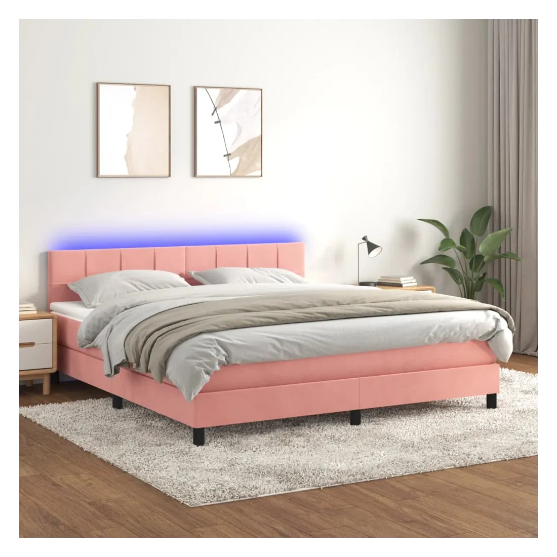 Utilisez ce sommier tapissier avec matelas et LED pour profiter d'un sommeil réparateur ! C'est le point central de votre chambre à coucher. Velours doux : le velours est un tissu doux et luxueux qui se reconnaît à son tas dense de fibres uniformément coupées qui ont une touche lisse. Le tissu en velours présente un toucher doux distinctif, ce qui le rend confortable au toucher.Tête de lit pratique : la tête de lit est réglable en hauteur selon vos préférences. La tête de lit vous offre un excellent soutien du dos lorsque vous êtes assis dans votre lit pour lire ou regarder la télévision.Bande LED colorée : apportez de l'éclairage dans l'obscurité avec des lumières LED colorées !Matelas à ressorts ensachés : le ressort ensaché individuel intégré est connu pour sa très haute qualité tout en assurant un haut niveau de durabilité et d'adaptabilité. Il peut absorber efficacement le bruit et les chocs causés par les sauts et les rotations.Protège-matelas doux pour la peau : le protège-matelas est recouvert d'un tissu résistant et doux pour la peau, ce qui le rend souple et confortable. Remarque :Pour des raisons d'hygiène, le matelas ne peut pas être retourné si l'emballage est retiré ou ouvert.Chaque produit est livré avec un manuel de montage dans la boîte pour un montage facile.Seule la partie avec un symbole de ciseaux peut être coupée et seule la partie avec l'USB continuera à fonctionner comme avant.Ce produit est doté d'un connecteur USB, mais la source d'alimentation certifiée de USB 5V n'est pas incluse.