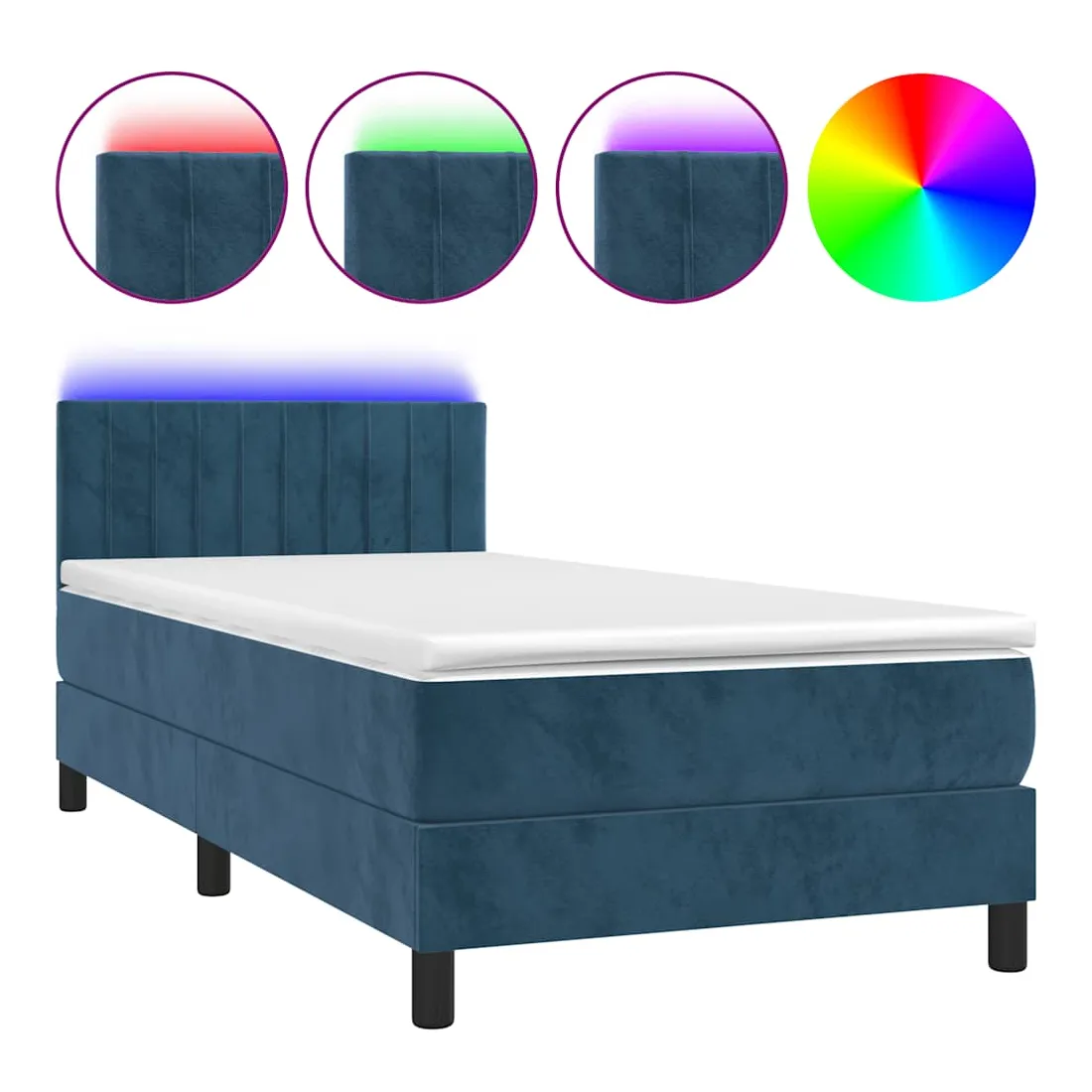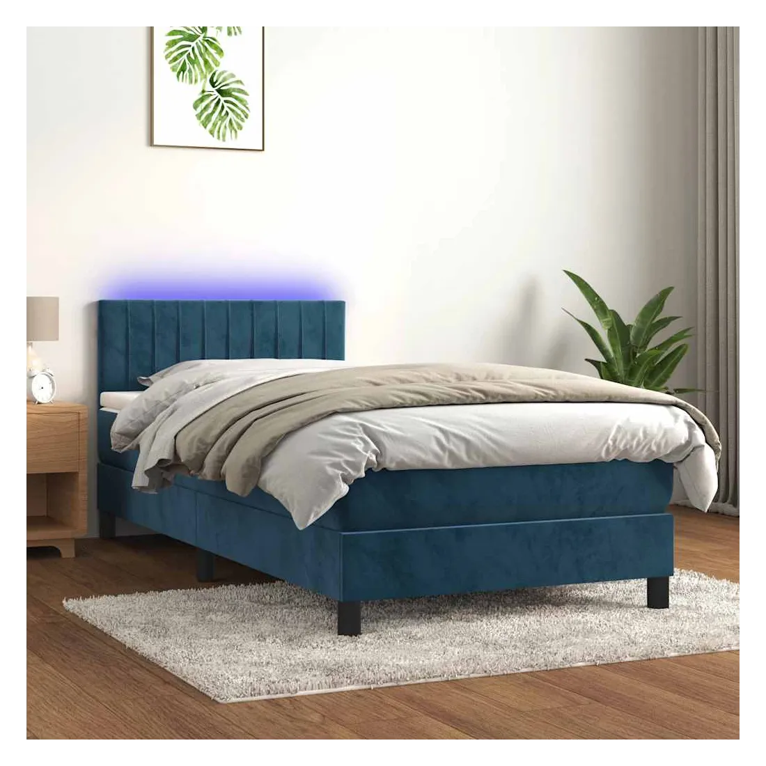 Utilisez ce sommier tapissier avec matelas et LED pour profiter d'un sommeil réparateur ! C'est le point central de votre chambre à coucher. Velours doux : le velours est un tissu doux et luxueux qui se reconnaît à son tas dense de fibres uniformément coupées qui ont une touche lisse. Le tissu en velours présente un toucher doux distinctif, ce qui le rend confortable au toucher.Tête de lit pratique : la tête de lit est réglable en hauteur selon vos préférences. La tête de lit vous offre un excellent soutien du dos lorsque vous êtes assis dans votre lit pour lire ou regarder la télévision.Bande LED colorée : apportez de l'éclairage dans l'obscurité avec des lumières LED colorées !Matelas à ressorts ensachés : le ressort ensaché individuel intégré est connu pour sa très haute qualité tout en assurant un haut niveau de durabilité et d'adaptabilité. Il peut absorber efficacement le bruit et les chocs causés par les sauts et les rotations.Protège-matelas doux pour la peau : le protège-matelas est recouvert d'un tissu résistant et doux pour la peau, ce qui le rend souple et confortable. Remarque :Pour des raisons d'hygiène, le matelas ne peut pas être retourné si l'emballage est retiré ou ouvert.Chaque produit est livré avec un manuel de montage dans la boîte pour un montage facile.Seule la partie avec un symbole de ciseaux peut être coupée et seule la partie avec l'USB continuera à fonctionner comme avant.Ce produit est doté d'un connecteur USB, mais la source d'alimentation certifiée de USB 5V n'est pas incluse.
