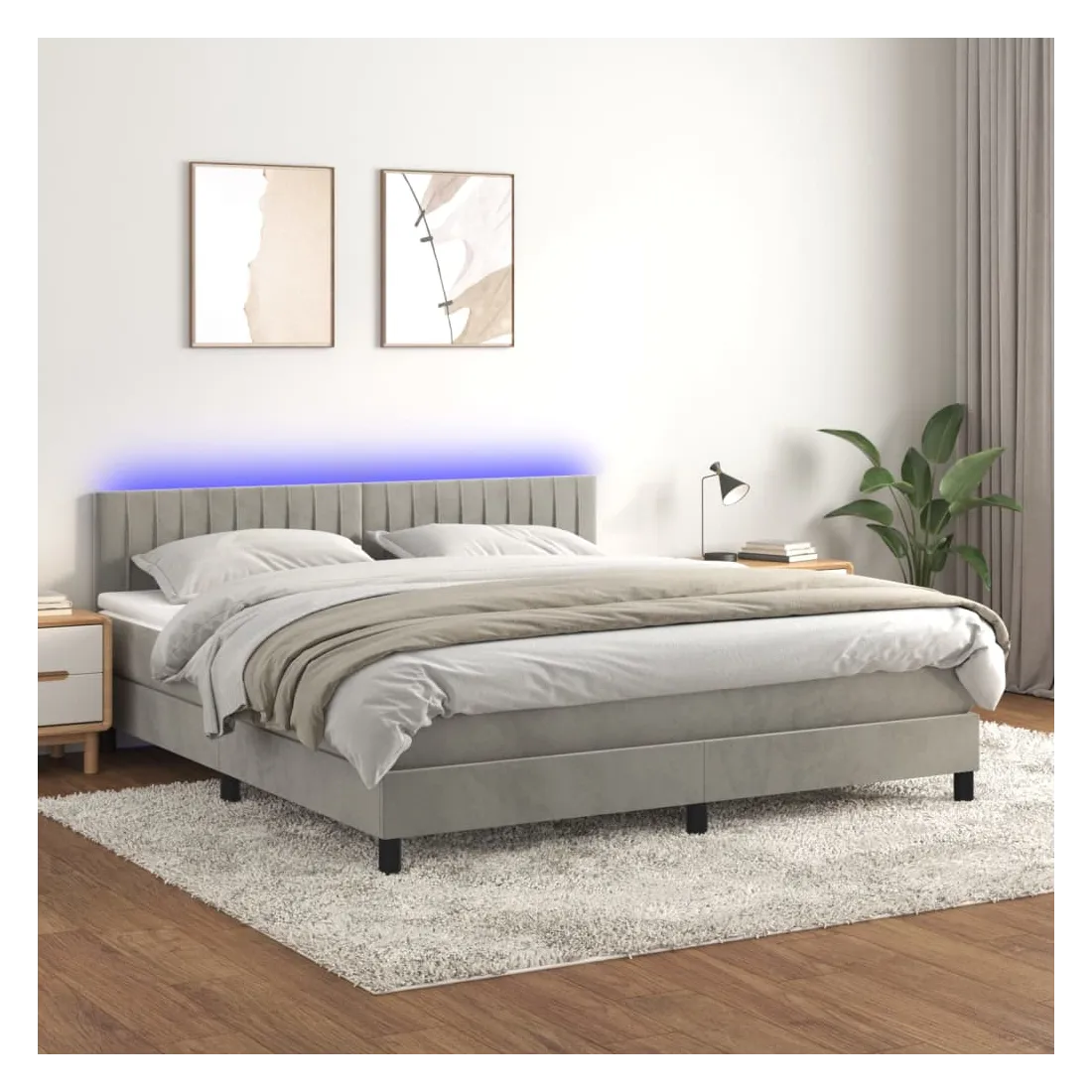 Utilisez ce sommier tapissier avec matelas et LED pour profiter d'un sommeil réparateur ! C'est le point central de votre chambre à coucher. Velours doux : le velours est un tissu doux et luxueux qui se reconnaît à son tas dense de fibres uniformément coupées qui ont une touche lisse. Le tissu en velours présente un toucher doux distinctif, ce qui le rend confortable au toucher.Tête de lit pratique : la tête de lit est réglable en hauteur selon vos préférences. La tête de lit vous offre un excellent soutien du dos lorsque vous êtes assis dans votre lit pour lire ou regarder la télévision.Bande LED colorée : apportez de l'éclairage dans l'obscurité avec des lumières LED colorées !Matelas à ressorts ensachés : le ressort ensaché individuel intégré est connu pour sa très haute qualité tout en assurant un haut niveau de durabilité et d'adaptabilité. Il peut absorber efficacement le bruit et les chocs causés par les sauts et les rotations.Protège-matelas doux pour la peau : le protège-matelas est recouvert d'un tissu résistant et doux pour la peau, ce qui le rend souple et confortable. Remarque :Pour des raisons d'hygiène, le matelas ne peut pas être retourné si l'emballage est retiré ou ouvert.Chaque produit est livré avec un manuel de montage dans la boîte pour un montage facile.Seule la partie avec un symbole de ciseaux peut être coupée et seule la partie avec l'USB continuera à fonctionner comme avant.Ce produit est doté d'un connecteur USB, mais la source d'alimentation certifiée de USB 5V n'est pas incluse.