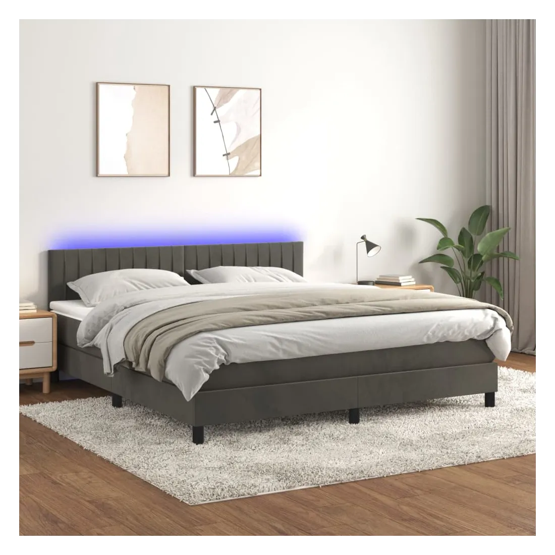 Utilisez ce sommier tapissier avec matelas et LED pour profiter d'un sommeil réparateur ! C'est le point central de votre chambre à coucher. Velours doux : le velours est un tissu doux et luxueux qui se reconnaît à son tas dense de fibres uniformément coupées qui ont une touche lisse. Le tissu en velours présente un toucher doux distinctif, ce qui le rend confortable au toucher.Tête de lit pratique : la tête de lit est réglable en hauteur selon vos préférences. La tête de lit vous offre un excellent soutien du dos lorsque vous êtes assis dans votre lit pour lire ou regarder la télévision.Bande LED colorée : apportez de l'éclairage dans l'obscurité avec des lumières LED colorées !Matelas à ressorts ensachés : le ressort ensaché individuel intégré est connu pour sa très haute qualité tout en assurant un haut niveau de durabilité et d'adaptabilité. Il peut absorber efficacement le bruit et les chocs causés par les sauts et les rotations.Protège-matelas doux pour la peau : le protège-matelas est recouvert d'un tissu résistant et doux pour la peau, ce qui le rend souple et confortable. Remarque :Pour des raisons d'hygiène, le matelas ne peut pas être retourné si l'emballage est retiré ou ouvert.Chaque produit est livré avec un manuel de montage dans la boîte pour un montage facile.Seule la partie avec un symbole de ciseaux peut être coupée et seule la partie avec l'USB continuera à fonctionner comme avant.Ce produit est doté d'un connecteur USB, mais la source d'alimentation certifiée de USB 5V n'est pas incluse.