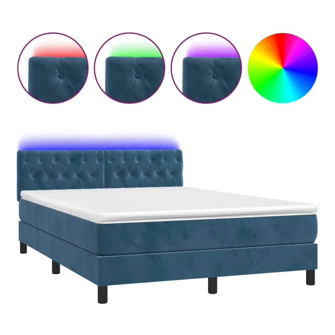 Utilisez ce sommier tapissier avec matelas et LED pour profiter d'un sommeil réparateur ! C'est le point central de votre chambre à coucher. Velours doux : le velours est un tissu doux et luxueux qui se reconnaît à son tas dense de fibres uniformément coupées qui ont une touche lisse. Le tissu en velours présente un toucher doux distinctif, ce qui le rend confortable au toucher.Tête de lit pratique : la tête de lit est réglable en hauteur selon vos préférences. La tête de lit vous offre un excellent soutien du dos lorsque vous êtes assis dans votre lit pour lire ou regarder la télévision.Bande LED colorée : apportez de l'éclairage dans l'obscurité avec des lumières LED colorées !Matelas à ressorts ensachés : le ressort ensaché individuel intégré est connu pour sa très haute qualité tout en assurant un haut niveau de durabilité et d'adaptabilité. Il peut absorber efficacement le bruit et les chocs causés par les sauts et les rotations.Protège-matelas doux pour la peau : le protège-matelas est recouvert d'un tissu résistant et doux pour la peau, ce qui le rend souple et confortable. Remarque :Pour des raisons d'hygiène, le matelas ne peut pas être retourné si l'emballage est retiré ou ouvert.Chaque produit est livré avec un manuel de montage dans la boîte pour un montage facile.Seule la partie avec un symbole de ciseaux peut être coupée et seule la partie avec l'USB continuera à fonctionner comme avant.Ce produit est doté d'un connecteur USB, mais la source d'alimentation certifiée de USB 5V n'est pas incluse.