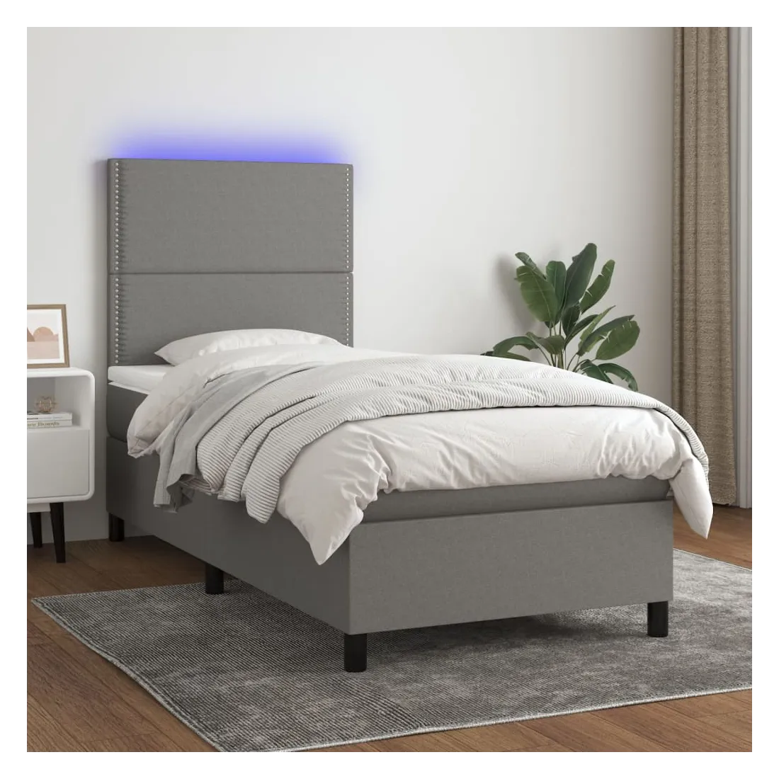 Utilisez ce sommier tapissier avec matelas et LED pour profiter d'un sommeil réparateur ! C'est le point central de votre chambre à coucher. Tissu durable : le tissu présente un aspect simple et épuré, et il est respirant et durable.Tête de lit pratique : la tête de lit est réglable en hauteur selon vos préférences. La tête de lit vous offre un excellent soutien du dos lorsque vous êtes assis dans votre lit pour lire ou regarder la télévision.Bande LED colorée : apportez de l'éclairage dans l'obscurité avec des lumières LED colorées !Matelas à ressorts ensachés : le ressort ensaché individuel intégré est connu pour sa très haute qualité tout en assurant un haut niveau de durabilité et d'adaptabilité. Il peut absorber efficacement le bruit et les chocs causés par les sauts et les rotations.Protège-matelas doux pour la peau : le protège-matelas est recouvert d'un tissu résistant et doux pour la peau, ce qui le rend souple et confortable. Remarque :Pour des raisons d'hygiène, le matelas ne peut pas être retourné si l'emballage est retiré ou ouvert.Seule la partie avec un symbole de ciseaux peut être coupée et seule la partie avec l'USB continuera à fonctionner comme avant.Chaque produit est livré avec un manuel de montage dans la boîte pour un montage facile.Ce produit est doté d'un connecteur USB, mais la source d'alimentation certifiée de USB 5V n'est pas incluse.