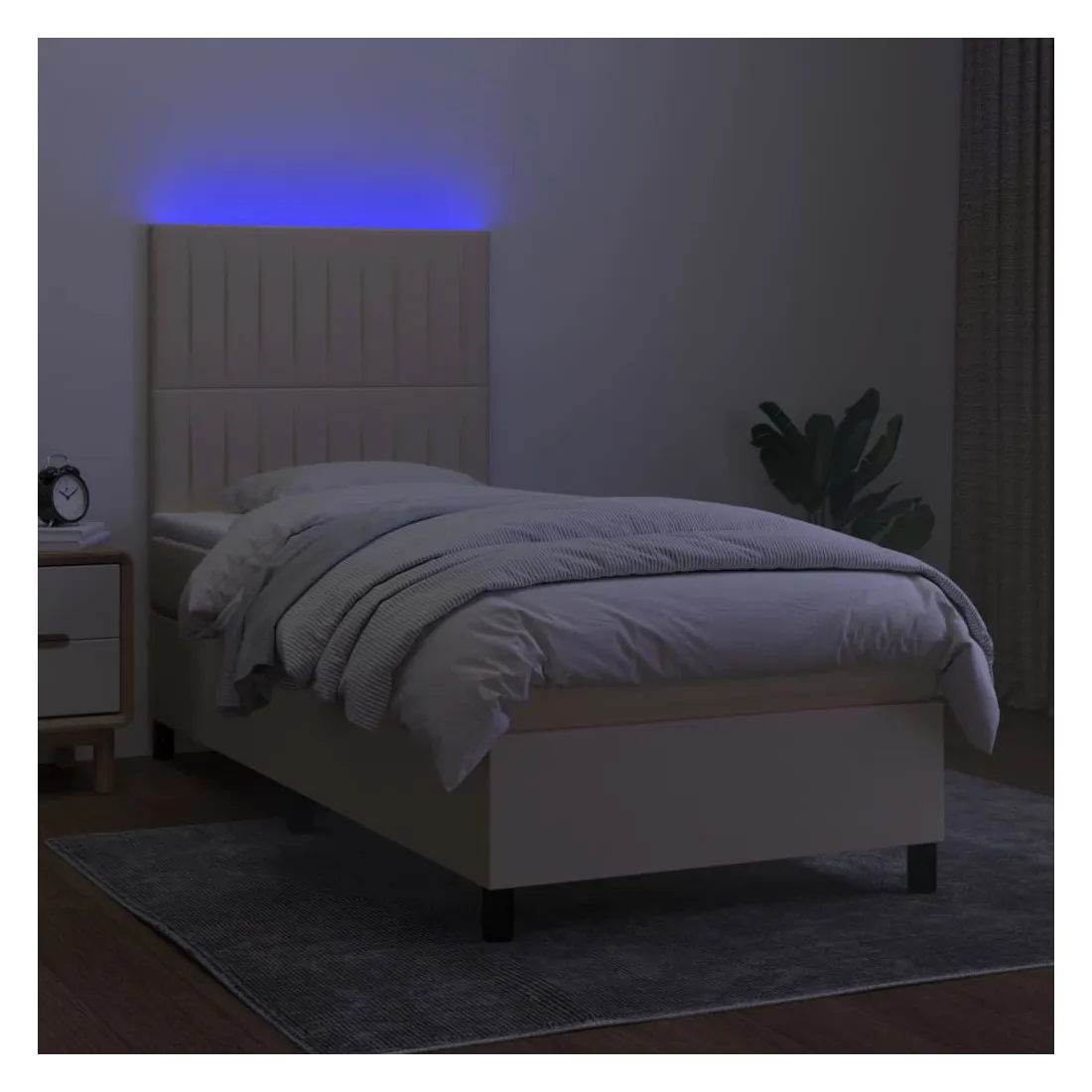 Utilisez ce sommier tapissier avec matelas et LED pour profiter d'un sommeil réparateur ! C'est le point central de votre chambre à coucher. Tissu durable : le tissu présente un aspect simple et épuré, et il est respirant et durable.Tête de lit pratique : la tête de lit est réglable en hauteur selon vos préférences. La tête de lit vous offre un excellent soutien du dos lorsque vous êtes assis dans votre lit pour lire ou regarder la télévision.Bande LED colorée : apportez de l'éclairage dans l'obscurité avec des lumières LED colorées !Matelas à ressorts ensachés : le ressort ensaché individuel intégré est connu pour sa très haute qualité tout en assurant un haut niveau de durabilité et d'adaptabilité. Il peut absorber efficacement le bruit et les chocs causés par les sauts et les rotations.Protège-matelas doux pour la peau : le protège-matelas est recouvert d'un tissu résistant et doux pour la peau, ce qui le rend souple et confortable. Remarque :Pour des raisons d'hygiène, le matelas ne peut pas être retourné si l'emballage est retiré ou ouvert.Seule la partie avec un symbole de ciseaux peut être coupée et seule la partie avec l'USB continuera à fonctionner comme avant.Chaque produit est livré avec un manuel de montage dans la boîte pour un montage facile.Ce produit est doté d'un connecteur USB, mais la source d'alimentation certifiée de USB 5V n'est pas incluse.