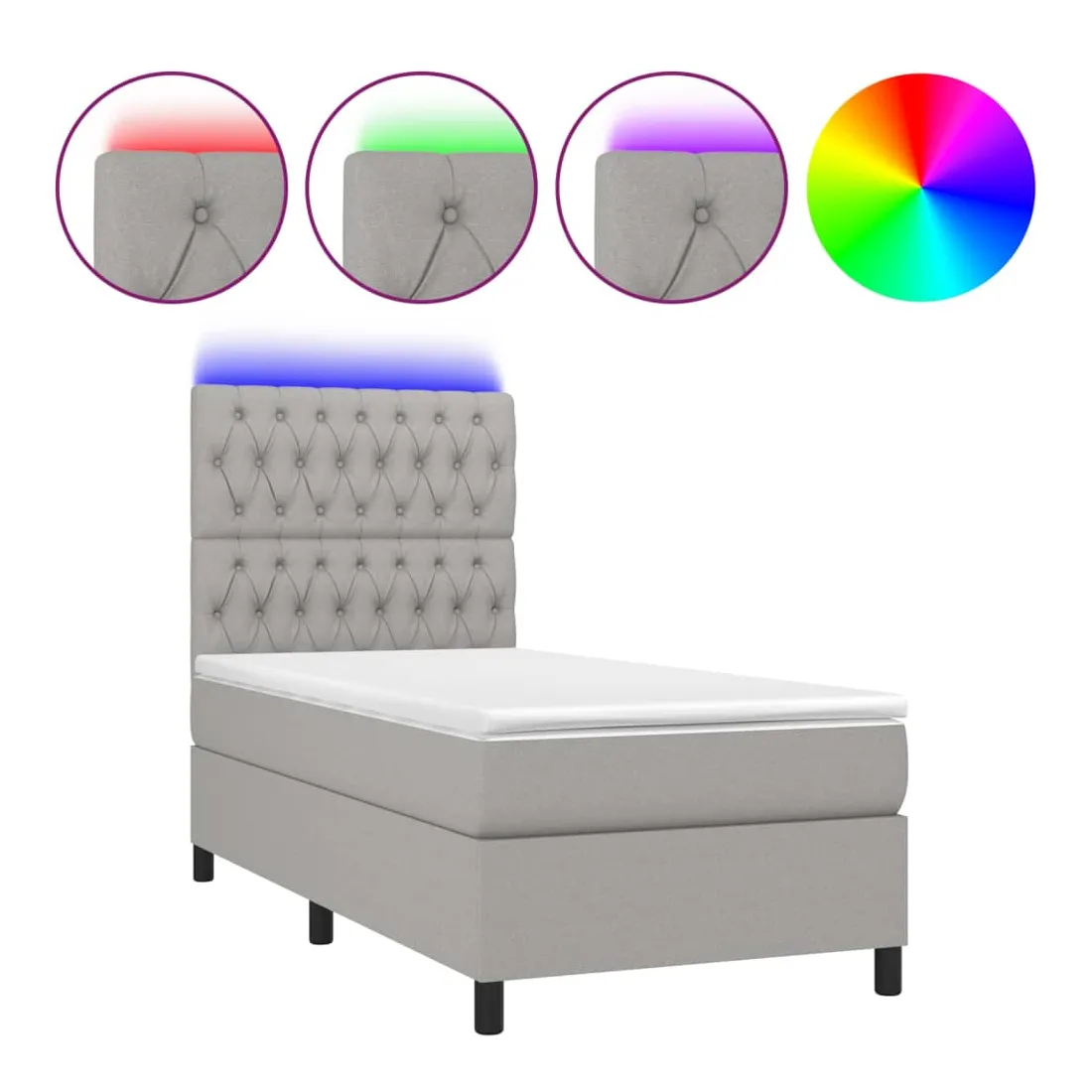 Utilisez ce sommier tapissier avec matelas et LED pour profiter d'un sommeil réparateur ! C'est le point central de votre chambre à coucher. Tissu durable : le tissu présente un aspect simple et épuré, et il est respirant et durable.Tête de lit pratique : la tête de lit est réglable en hauteur selon vos préférences. La tête de lit vous offre un excellent soutien du dos lorsque vous êtes assis dans votre lit pour lire ou regarder la télévision.Bande LED colorée : apportez de l'éclairage dans l'obscurité avec des lumières LED colorées !Matelas à ressorts ensachés : le ressort ensaché individuel intégré est connu pour sa très haute qualité tout en assurant un haut niveau de durabilité et d'adaptabilité. Il peut absorber efficacement le bruit et les chocs causés par les sauts et les rotations.Protège-matelas doux pour la peau : le protège-matelas est recouvert d'un tissu résistant et doux pour la peau, ce qui le rend souple et confortable. Remarque :Pour des raisons d'hygiène, le matelas ne peut pas être retourné si l'emballage est retiré ou ouvert.Seule la partie avec un symbole de ciseaux peut être coupée et seule la partie avec l'USB continuera à fonctionner comme avant.Chaque produit est livré avec un manuel de montage dans la boîte pour un montage facile.Ce produit est doté d'un connecteur USB, mais la source d'alimentation certifiée de USB 5V n'est pas incluse.