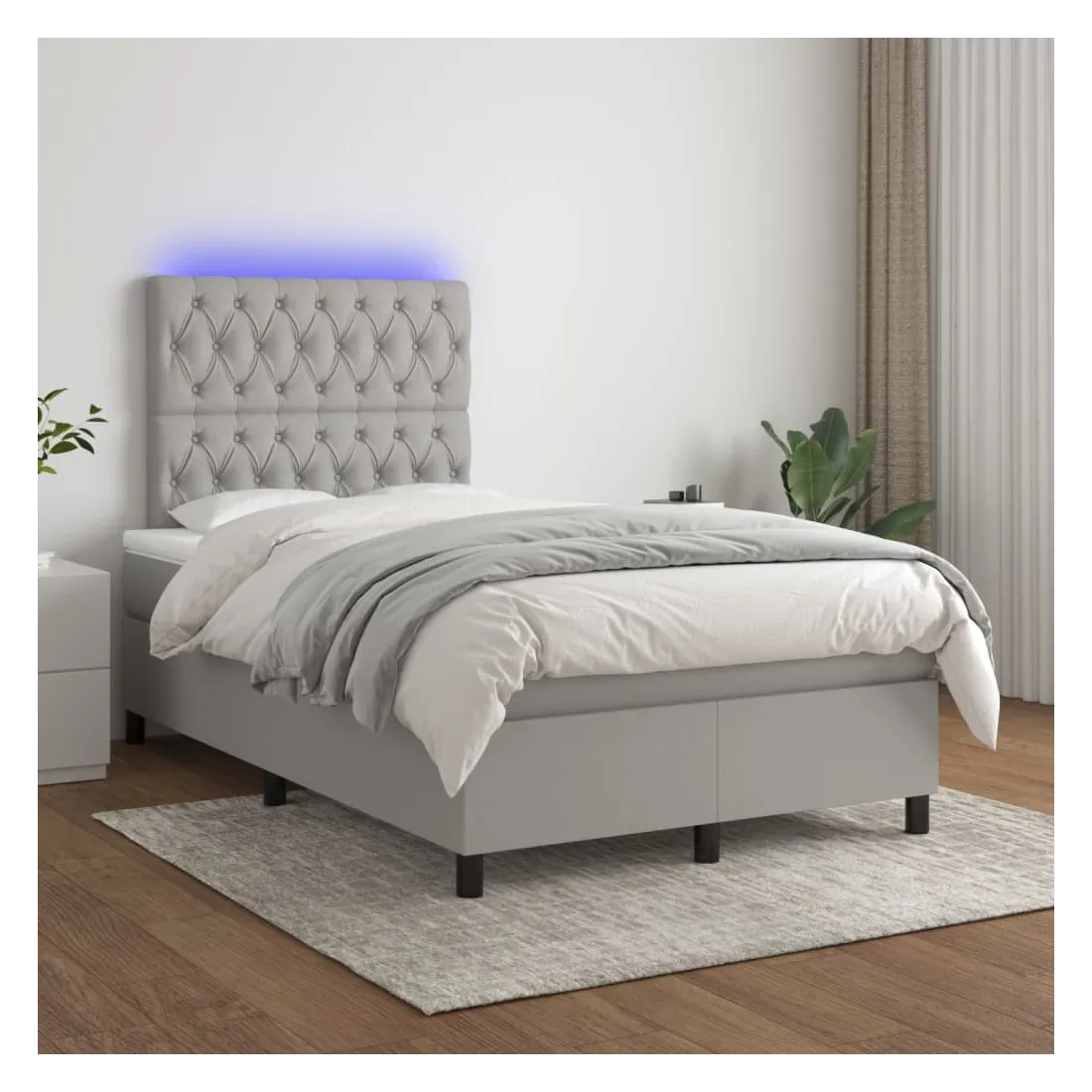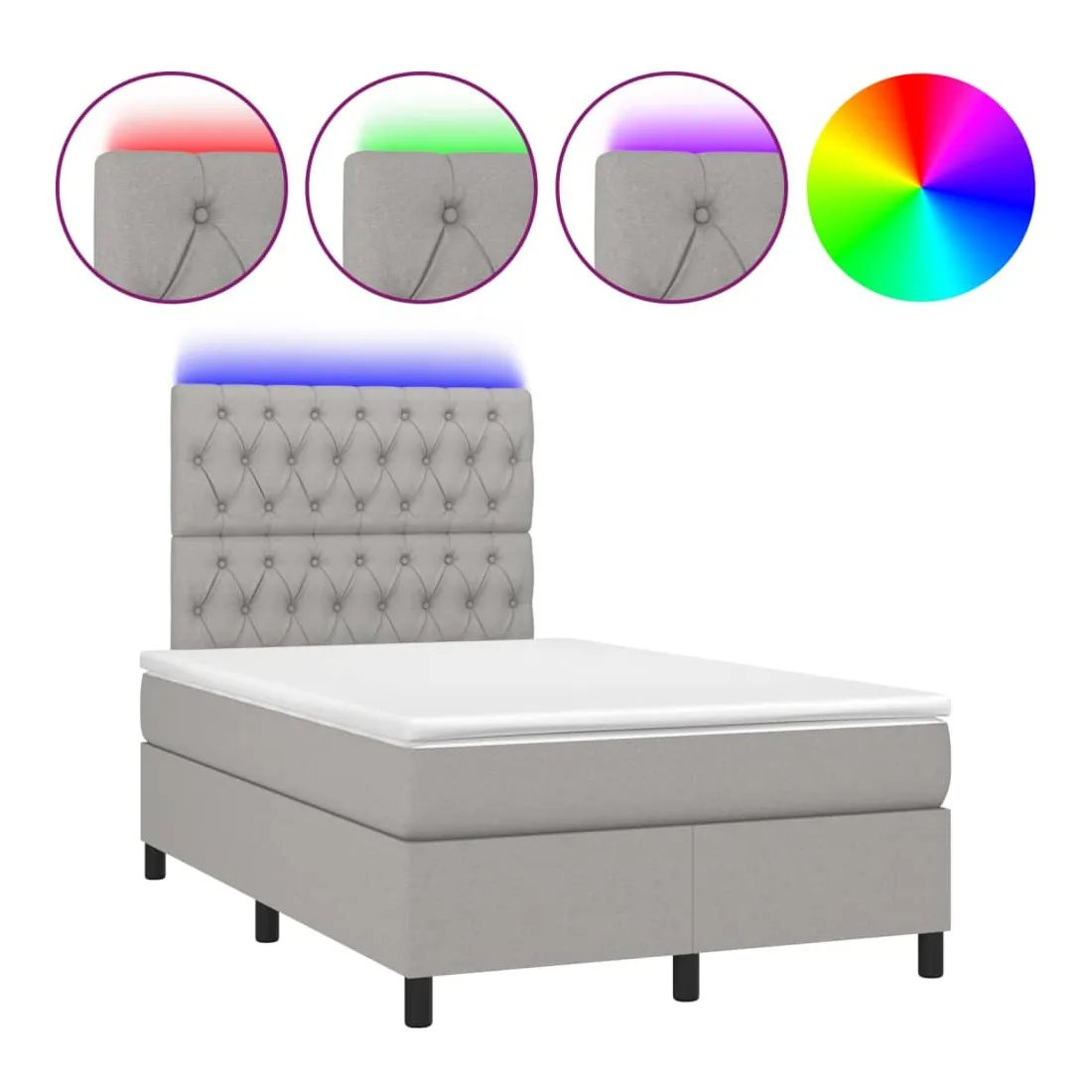 Utilisez ce sommier tapissier avec matelas et LED pour profiter d'un sommeil réparateur ! C'est le point central de votre chambre à coucher. Tissu durable : le tissu présente un aspect simple et épuré, et il est respirant et durable.Tête de lit pratique : la tête de lit est réglable en hauteur selon vos préférences. La tête de lit vous offre un excellent soutien du dos lorsque vous êtes assis dans votre lit pour lire ou regarder la télévision.Bande LED colorée : apportez de l'éclairage dans l'obscurité avec des lumières LED colorées !Matelas à ressorts ensachés : le ressort ensaché individuel intégré est connu pour sa très haute qualité tout en assurant un haut niveau de durabilité et d'adaptabilité. Il peut absorber efficacement le bruit et les chocs causés par les sauts et les rotations.Protège-matelas doux pour la peau : le protège-matelas est recouvert d'un tissu résistant et doux pour la peau, ce qui le rend souple et confortable. Remarque :Pour des raisons d'hygiène, le matelas ne peut pas être retourné si l'emballage est retiré ou ouvert.Seule la partie avec un symbole de ciseaux peut être coupée et seule la partie avec l'USB continuera à fonctionner comme avant.Chaque produit est livré avec un manuel de montage dans la boîte pour un montage facile.Ce produit est doté d'un connecteur USB, mais la source d'alimentation certifiée de USB 5V n'est pas incluse.