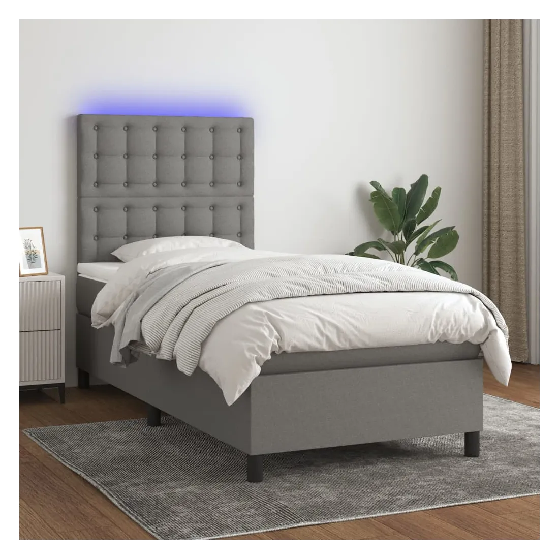 Utilisez ce sommier tapissier avec matelas et LED pour profiter d'un sommeil réparateur ! C'est le point central de votre chambre à coucher. Tissu durable : le tissu présente un aspect simple et épuré, et il est respirant et durable.Tête de lit pratique : la tête de lit est réglable en hauteur selon vos préférences. La tête de lit vous offre un excellent soutien du dos lorsque vous êtes assis dans votre lit pour lire ou regarder la télévision.Bande LED colorée : apportez de l'éclairage dans l'obscurité avec des lumières LED colorées !Matelas à ressorts ensachés : le ressort ensaché individuel intégré est connu pour sa très haute qualité tout en assurant un haut niveau de durabilité et d'adaptabilité. Il peut absorber efficacement le bruit et les chocs causés par les sauts et les rotations.Protège-matelas doux pour la peau : le protège-matelas est recouvert d'un tissu résistant et doux pour la peau, ce qui le rend souple et confortable. Remarque :Pour des raisons d'hygiène, le matelas ne peut pas être retourné si l'emballage est retiré ou ouvert.Seule la partie avec un symbole de ciseaux peut être coupée et seule la partie avec l'USB continuera à fonctionner comme avant.Chaque produit est livré avec un manuel de montage dans la boîte pour un montage facile.Ce produit est doté d'un connecteur USB, mais la source d'alimentation certifiée de USB 5V n'est pas incluse.