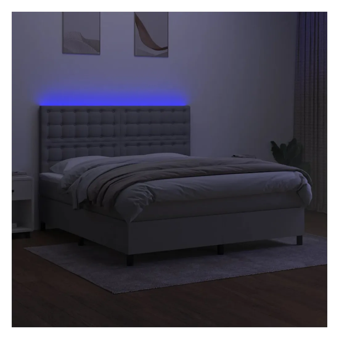 Utilisez ce sommier tapissier avec matelas et LED pour profiter d'un sommeil réparateur ! C'est le point central de votre chambre à coucher. Tissu durable : le tissu présente un aspect simple et épuré, et il est respirant et durable.Tête de lit pratique : la tête de lit est réglable en hauteur selon vos préférences. La tête de lit vous offre un excellent soutien du dos lorsque vous êtes assis dans votre lit pour lire ou regarder la télévision.Bande LED colorée : apportez de l'éclairage dans l'obscurité avec des lumières LED colorées !Matelas à ressorts ensachés : le ressort ensaché individuel intégré est connu pour sa très haute qualité tout en assurant un haut niveau de durabilité et d'adaptabilité. Il peut absorber efficacement le bruit et les chocs causés par les sauts et les rotations.Protège-matelas doux pour la peau : le protège-matelas est recouvert d'un tissu résistant et doux pour la peau, ce qui le rend souple et confortable. Remarque :Pour des raisons d'hygiène, le matelas ne peut pas être retourné si l'emballage est retiré ou ouvert.Seule la partie avec un symbole de ciseaux peut être coupée et seule la partie avec l'USB continuera à fonctionner comme avant.Chaque produit est livré avec un manuel de montage dans la boîte pour un montage facile.Ce produit est doté d'un connecteur USB, mais la source d'alimentation certifiée de USB 5V n'est pas incluse.
