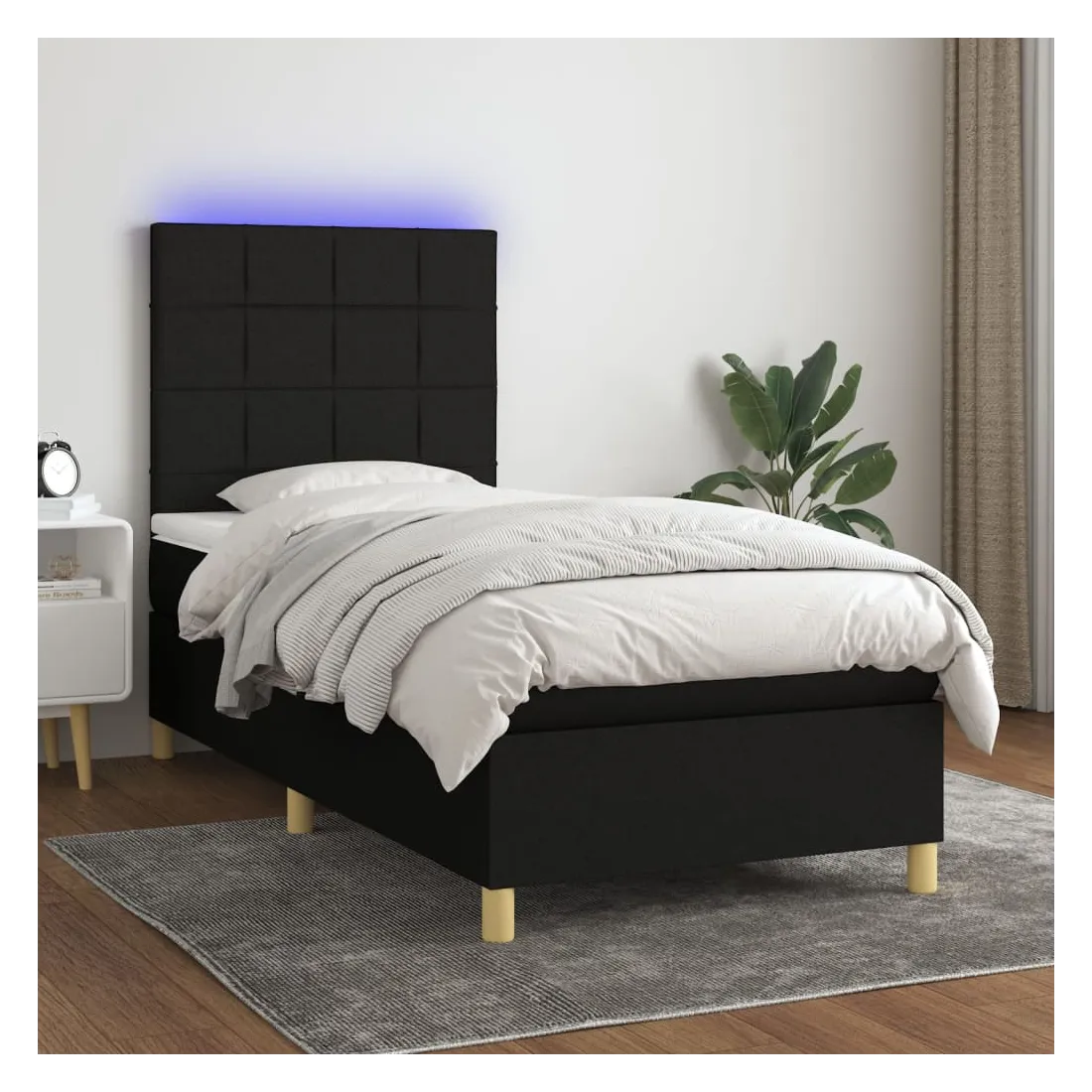 Utilisez ce sommier tapissier avec matelas et LED pour profiter d'un sommeil réparateur ! C'est le point central de votre chambre à coucher. Tissu durable : le tissu présente un aspect simple et épuré, et il est respirant et durable.Tête de lit pratique : la tête de lit est réglable en hauteur selon vos préférences. La tête de lit vous offre un excellent soutien du dos lorsque vous êtes assis dans votre lit pour lire ou regarder la télévision.Bande LED colorée : apportez de l'éclairage dans l'obscurité avec des lumières LED colorées !Matelas à ressorts ensachés : le ressort ensaché individuel intégré est connu pour sa très haute qualité tout en assurant un haut niveau de durabilité et d'adaptabilité. Il peut absorber efficacement le bruit et les chocs causés par les sauts et les rotations.Protège-matelas doux pour la peau : le protège-matelas est recouvert d'un tissu résistant et doux pour la peau, ce qui le rend souple et confortable. Remarque :Pour des raisons d'hygiène, le matelas ne peut pas être retourné si l'emballage est retiré ou ouvert.Seule la partie avec un symbole de ciseaux peut être coupée et seule la partie avec l'USB continuera à fonctionner comme avant.Chaque produit est livré avec un manuel de montage dans la boîte pour un montage facile.Ce produit est doté d'un connecteur USB, mais la source d'alimentation certifiée de USB 5V n'est pas incluse.