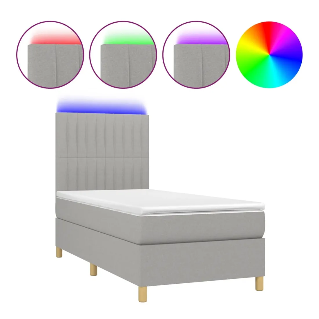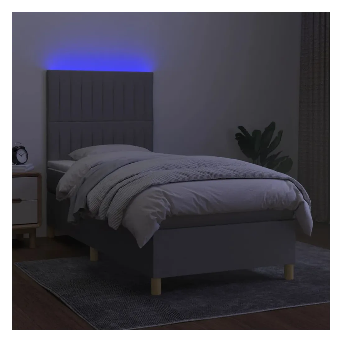 Utilisez ce sommier tapissier avec matelas et LED pour profiter d'un sommeil réparateur ! C'est le point central de votre chambre à coucher. Tissu durable : le tissu présente un aspect simple et épuré, et il est respirant et durable.Tête de lit pratique : la tête de lit est réglable en hauteur selon vos préférences. La tête de lit vous offre un excellent soutien du dos lorsque vous êtes assis dans votre lit pour lire ou regarder la télévision.Bande LED colorée : apportez de l'éclairage dans l'obscurité avec des lumières LED colorées !Matelas à ressorts ensachés : le ressort ensaché individuel intégré est connu pour sa très haute qualité tout en assurant un haut niveau de durabilité et d'adaptabilité. Il peut absorber efficacement le bruit et les chocs causés par les sauts et les rotations.Protège-matelas doux pour la peau : le protège-matelas est recouvert d'un tissu résistant et doux pour la peau, ce qui le rend souple et confortable. Remarque :Pour des raisons d'hygiène, le matelas ne peut pas être retourné si l'emballage est retiré ou ouvert.Seule la partie avec un symbole de ciseaux peut être coupée et seule la partie avec l'USB continuera à fonctionner comme avant.Chaque produit est livré avec un manuel de montage dans la boîte pour un montage facile.Ce produit est doté d'un connecteur USB, mais la source d'alimentation certifiée de USB 5V n'est pas incluse.