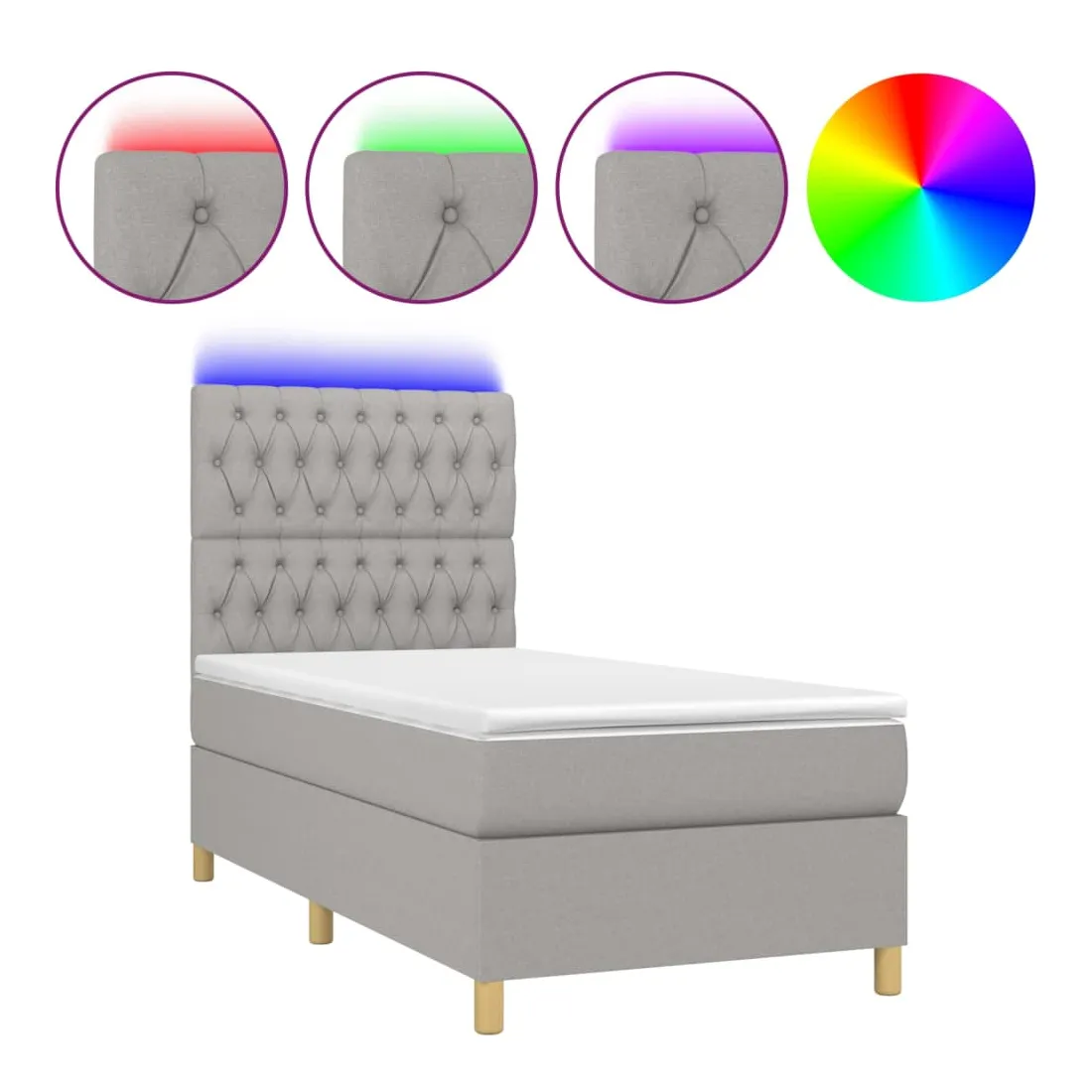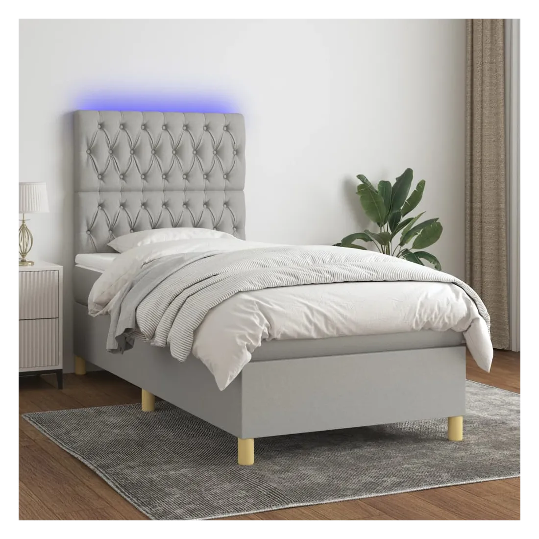 Utilisez ce sommier tapissier avec matelas et LED pour profiter d'un sommeil réparateur ! C'est le point central de votre chambre à coucher. Tissu durable : le tissu présente un aspect simple et épuré, et il est respirant et durable.Tête de lit pratique : la tête de lit est réglable en hauteur selon vos préférences. La tête de lit vous offre un excellent soutien du dos lorsque vous êtes assis dans votre lit pour lire ou regarder la télévision.Bande LED colorée : apportez de l'éclairage dans l'obscurité avec des lumières LED colorées !Matelas à ressorts ensachés : le ressort ensaché individuel intégré est connu pour sa très haute qualité tout en assurant un haut niveau de durabilité et d'adaptabilité. Il peut absorber efficacement le bruit et les chocs causés par les sauts et les rotations.Protège-matelas doux pour la peau : le protège-matelas est recouvert d'un tissu résistant et doux pour la peau, ce qui le rend souple et confortable. Remarque :Pour des raisons d'hygiène, le matelas ne peut pas être retourné si l'emballage est retiré ou ouvert.Seule la partie avec un symbole de ciseaux peut être coupée et seule la partie avec l'USB continuera à fonctionner comme avant.Chaque produit est livré avec un manuel de montage dans la boîte pour un montage facile.Ce produit est doté d'un connecteur USB, mais la source d'alimentation certifiée de USB 5V n'est pas incluse.