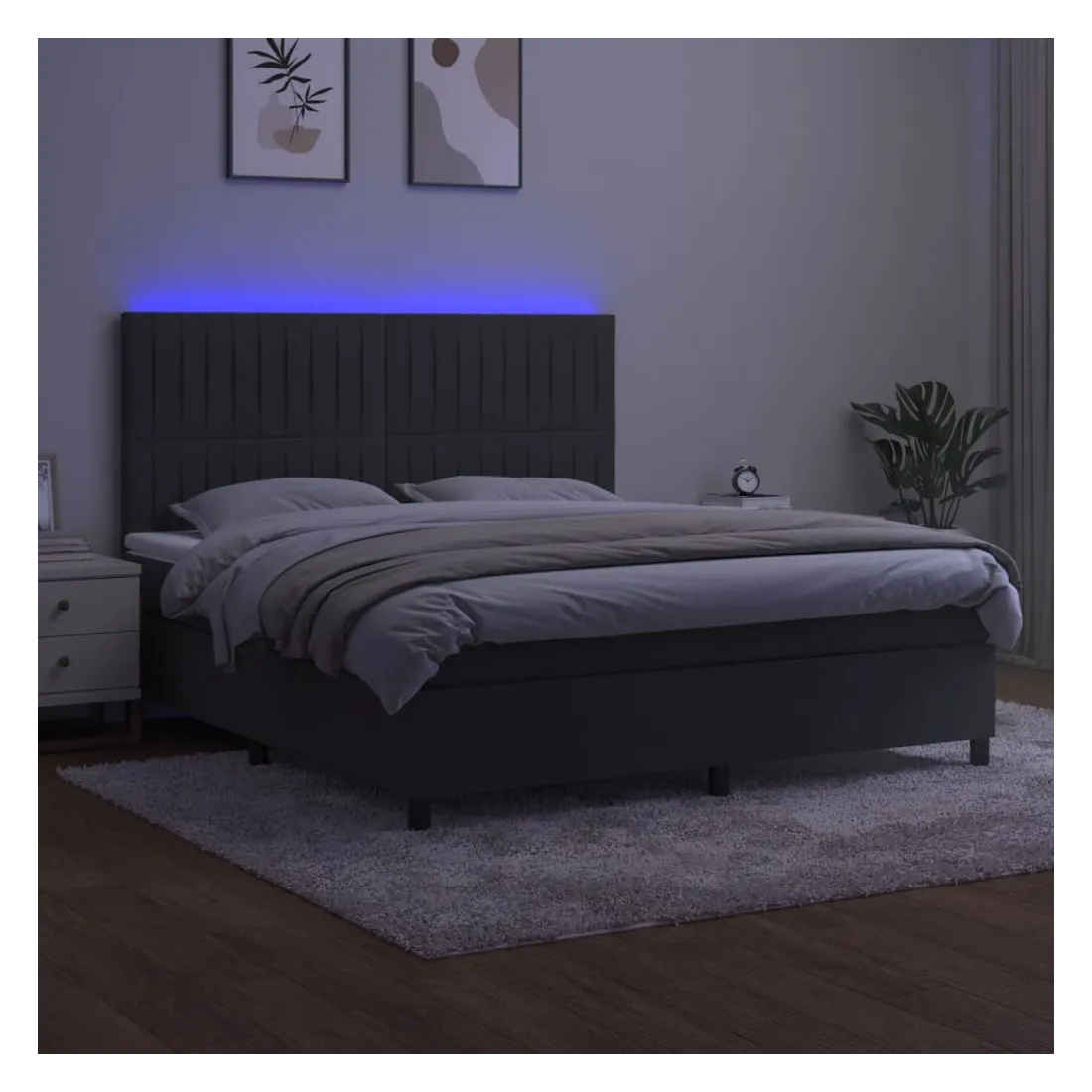 Utilisez ce sommier tapissier avec matelas et LED pour profiter d'un sommeil réparateur ! C'est le point central de votre chambre à coucher. Velours doux : le velours est un tissu doux et luxueux qui se reconnaît à son tas dense de fibres uniformément coupées qui ont une touche lisse. Le tissu en velours présente un toucher doux distinctif, ce qui le rend confortable au toucher.Tête de lit pratique : la tête de lit est réglable en hauteur selon vos préférences. La tête de lit vous offre un excellent soutien du dos lorsque vous êtes assis dans votre lit pour lire ou regarder la télévision.Bande LED colorée : apportez de l'éclairage dans l'obscurité avec des lumières LED colorées !Matelas à ressorts ensachés : le ressort ensaché individuel intégré est connu pour sa très haute qualité tout en assurant un haut niveau de durabilité et d'adaptabilité. Il peut absorber efficacement le bruit et les chocs causés par les sauts et les rotations.Protège-matelas doux pour la peau : le protège-matelas est recouvert d'un tissu résistant et doux pour la peau, ce qui le rend souple et confortable. Remarque :Pour des raisons d'hygiène, le matelas ne peut pas être retourné si l'emballage est retiré ou ouvert.Seule la partie avec un symbole de ciseaux peut être coupée et seule la partie avec l'USB continuera à fonctionner comme avant.Chaque produit est livré avec un manuel de montage dans la boîte pour un montage facile.Ce produit est doté d'un connecteur USB, mais la source d'alimentation certifiée de USB 5V n'est pas incluse.