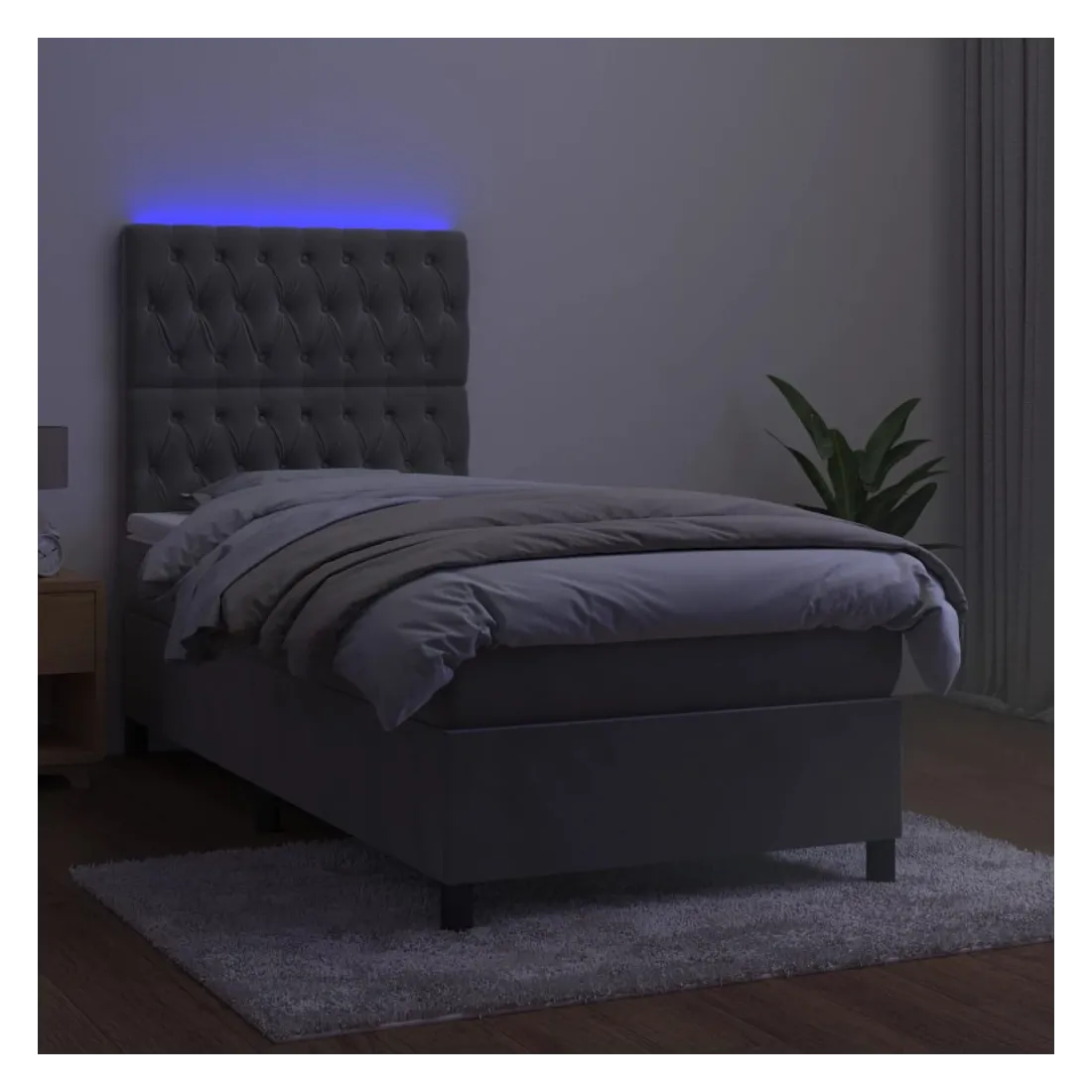 Utilisez ce sommier tapissier avec matelas et LED pour profiter d'un sommeil réparateur ! C'est le point central de votre chambre à coucher. Velours doux : le velours est un tissu doux et luxueux qui se reconnaît à son tas dense de fibres uniformément coupées qui ont une touche lisse. Le tissu en velours présente un toucher doux distinctif, ce qui le rend confortable au toucher.Tête de lit pratique : la tête de lit est réglable en hauteur selon vos préférences. La tête de lit vous offre un excellent soutien du dos lorsque vous êtes assis dans votre lit pour lire ou regarder la télévision.Bande LED colorée : apportez de l'éclairage dans l'obscurité avec des lumières LED colorées !Matelas à ressorts ensachés : le ressort ensaché individuel intégré est connu pour sa très haute qualité tout en assurant un haut niveau de durabilité et d'adaptabilité. Il peut absorber efficacement le bruit et les chocs causés par les sauts et les rotations.Protège-matelas doux pour la peau : le protège-matelas est recouvert d'un tissu résistant et doux pour la peau, ce qui le rend souple et confortable. Remarque :Pour des raisons d'hygiène, le matelas ne peut pas être retourné si l'emballage est retiré ou ouvert.Seule la partie avec un symbole de ciseaux peut être coupée et seule la partie avec l'USB continuera à fonctionner comme avant.Chaque produit est livré avec un manuel de montage dans la boîte pour un montage facile.Ce produit est doté d'un connecteur USB, mais la source d'alimentation certifiée de USB 5V n'est pas incluse.