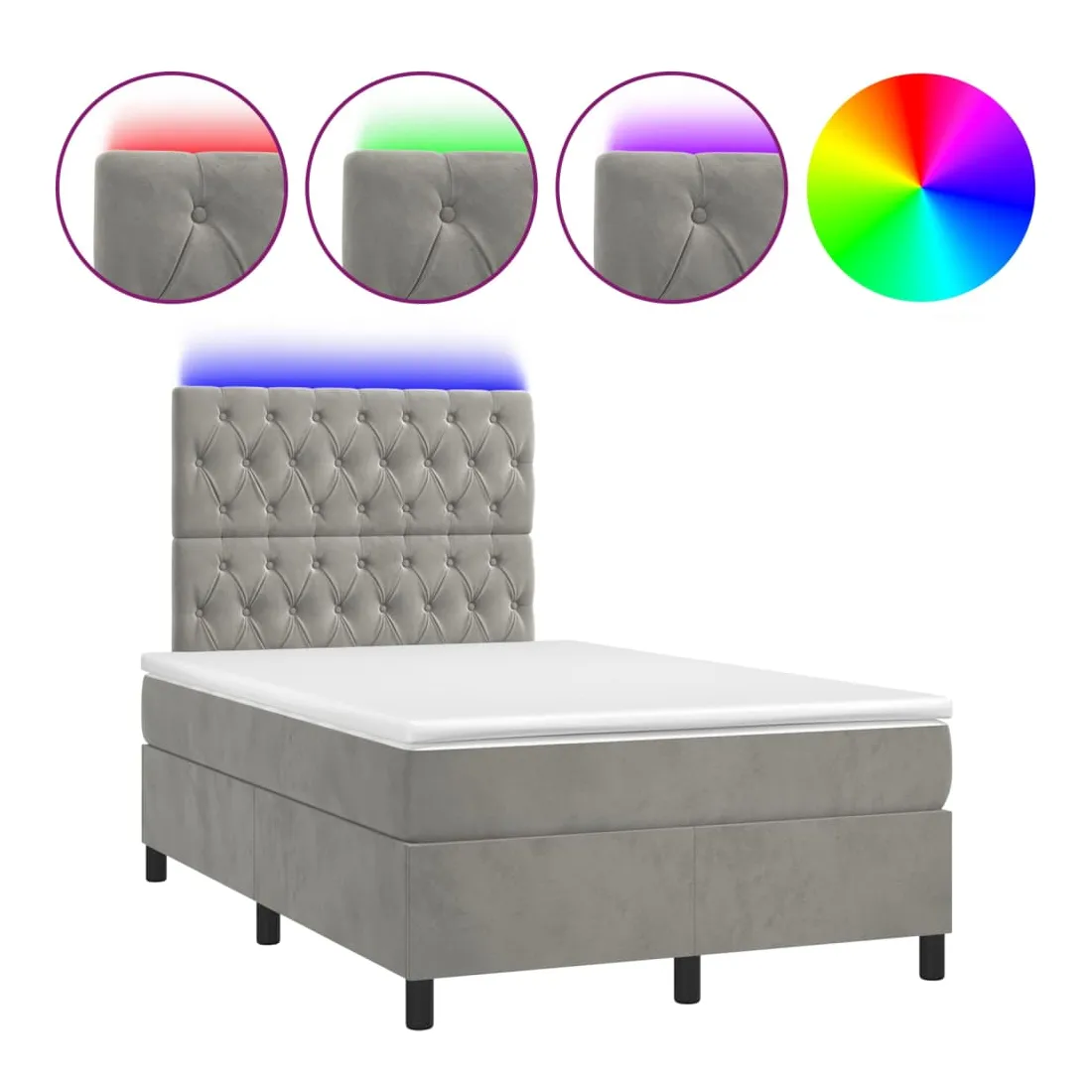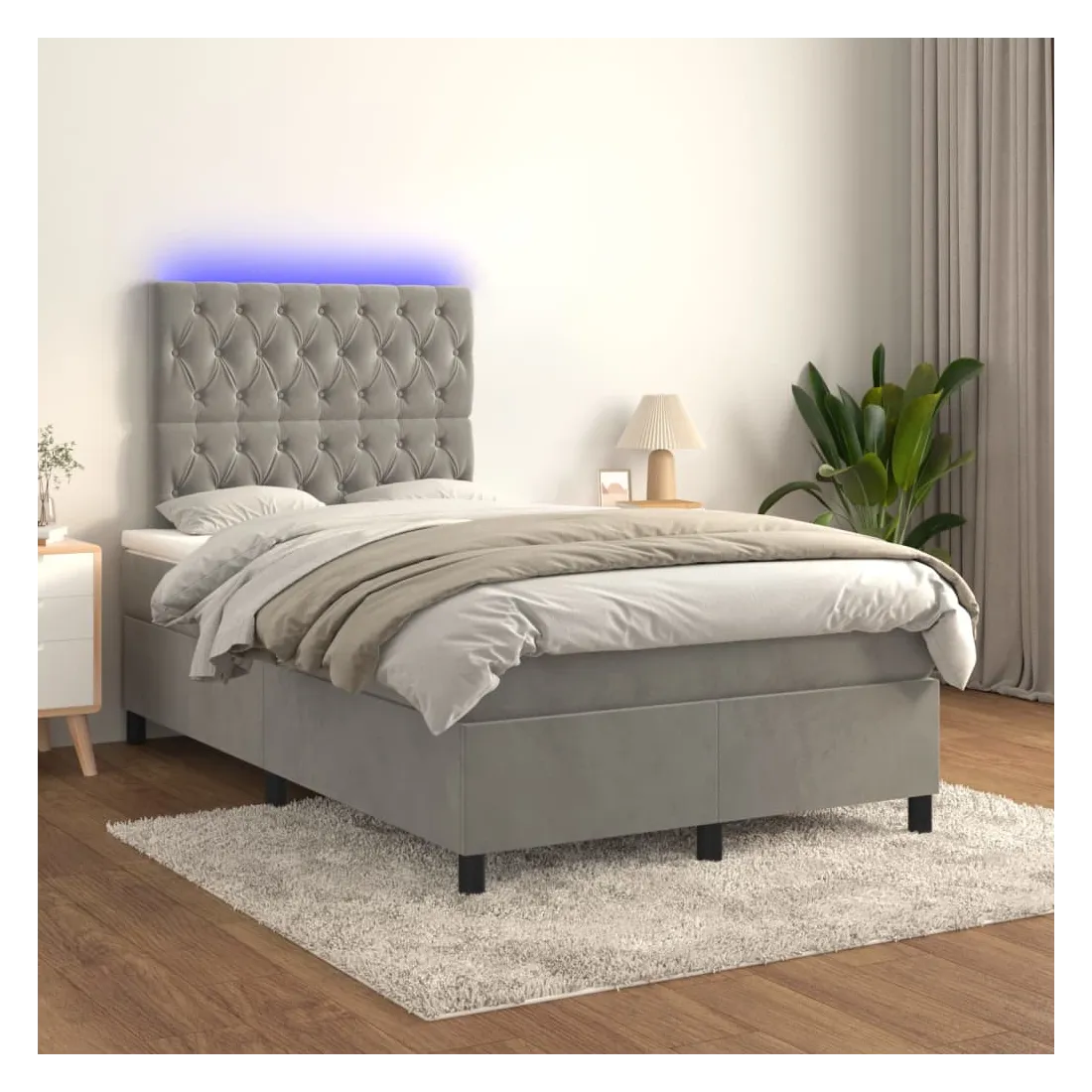Utilisez ce sommier tapissier avec matelas et LED pour profiter d'un sommeil réparateur ! C'est le point central de votre chambre à coucher. Velours doux : le velours est un tissu doux et luxueux qui se reconnaît à son tas dense de fibres uniformément coupées qui ont une touche lisse. Le tissu en velours présente un toucher doux distinctif, ce qui le rend confortable au toucher.Tête de lit pratique : la tête de lit est réglable en hauteur selon vos préférences. La tête de lit vous offre un excellent soutien du dos lorsque vous êtes assis dans votre lit pour lire ou regarder la télévision.Bande LED colorée : apportez de l'éclairage dans l'obscurité avec des lumières LED colorées !Matelas à ressorts ensachés : le ressort ensaché individuel intégré est connu pour sa très haute qualité tout en assurant un haut niveau de durabilité et d'adaptabilité. Il peut absorber efficacement le bruit et les chocs causés par les sauts et les rotations.Protège-matelas doux pour la peau : le protège-matelas est recouvert d'un tissu résistant et doux pour la peau, ce qui le rend souple et confortable. Remarque :Pour des raisons d'hygiène, le matelas ne peut pas être retourné si l'emballage est retiré ou ouvert.Seule la partie avec un symbole de ciseaux peut être coupée et seule la partie avec l'USB continuera à fonctionner comme avant.Chaque produit est livré avec un manuel de montage dans la boîte pour un montage facile.Ce produit est doté d'un connecteur USB, mais la source d'alimentation certifiée de USB 5V n'est pas incluse.