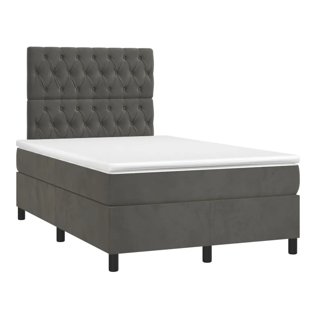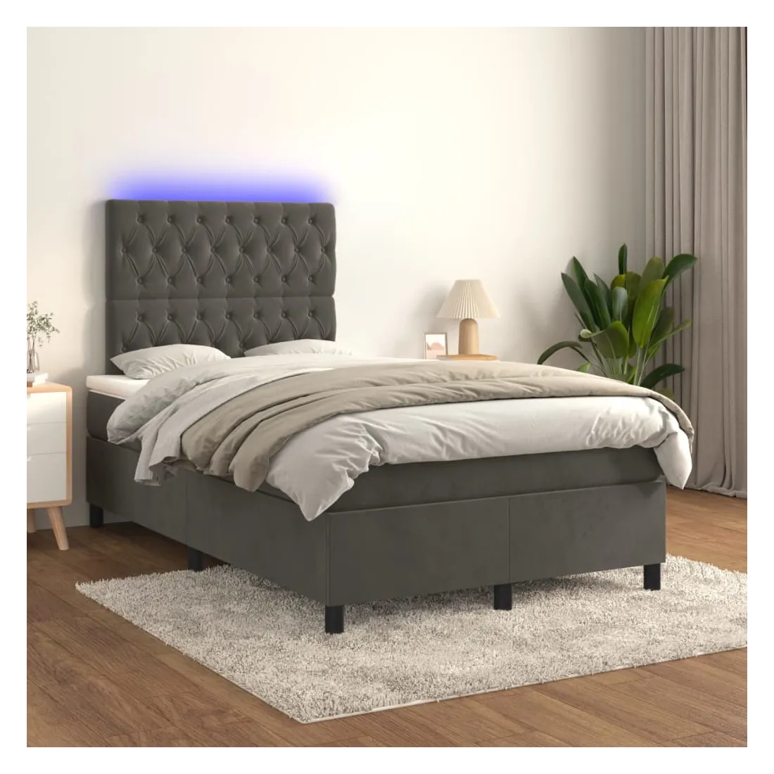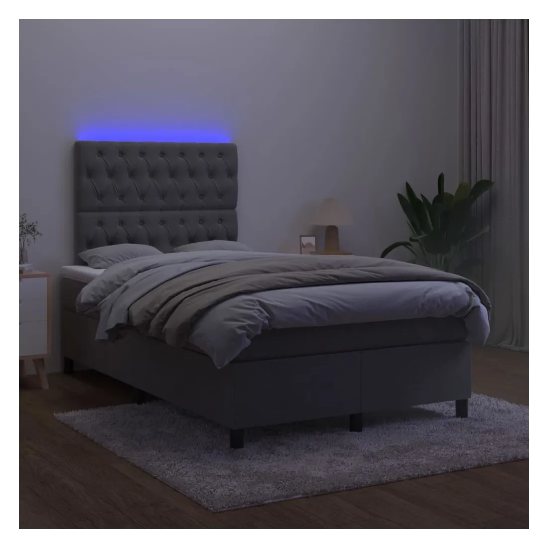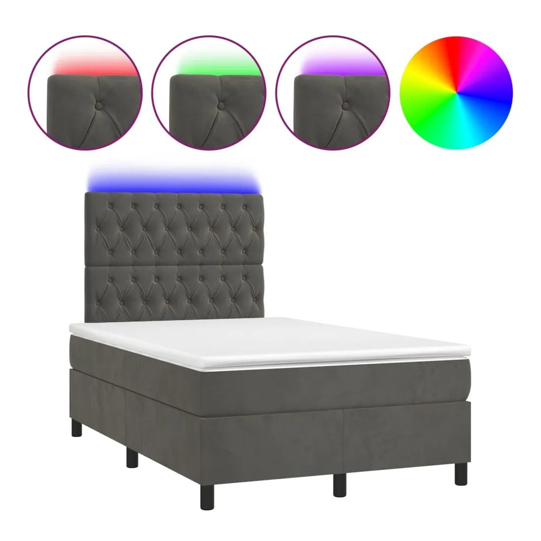Utilisez ce sommier tapissier avec matelas et LED pour profiter d'un sommeil réparateur ! C'est le point central de votre chambre à coucher. Velours doux : le velours est un tissu doux et luxueux qui se reconnaît à son tas dense de fibres uniformément coupées qui ont une touche lisse. Le tissu en velours présente un toucher doux distinctif, ce qui le rend confortable au toucher.Tête de lit pratique : la tête de lit est réglable en hauteur selon vos préférences. La tête de lit vous offre un excellent soutien du dos lorsque vous êtes assis dans votre lit pour lire ou regarder la télévision.Bande LED colorée : apportez de l'éclairage dans l'obscurité avec des lumières LED colorées !Matelas à ressorts ensachés : le ressort ensaché individuel intégré est connu pour sa très haute qualité tout en assurant un haut niveau de durabilité et d'adaptabilité. Il peut absorber efficacement le bruit et les chocs causés par les sauts et les rotations.Protège-matelas doux pour la peau : le protège-matelas est recouvert d'un tissu résistant et doux pour la peau, ce qui le rend souple et confortable. Remarque :Pour des raisons d'hygiène, le matelas ne peut pas être retourné si l'emballage est retiré ou ouvert.Seule la partie avec un symbole de ciseaux peut être coupée et seule la partie avec l'USB continuera à fonctionner comme avant.Chaque produit est livré avec un manuel de montage dans la boîte pour un montage facile.Ce produit est doté d'un connecteur USB, mais la source d'alimentation certifiée de USB 5V n'est pas incluse.