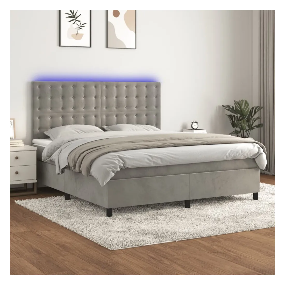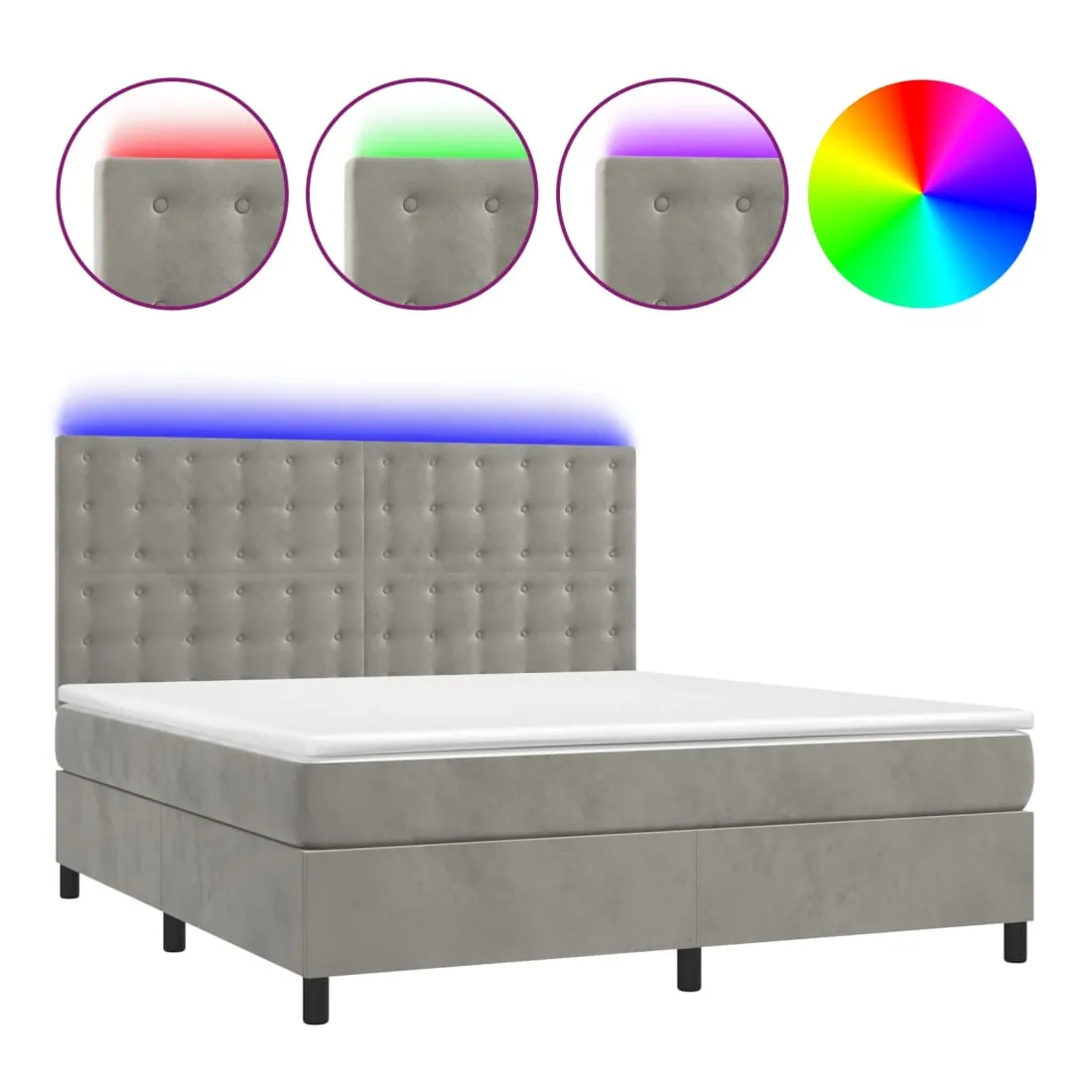 Utilisez ce sommier tapissier avec matelas et LED pour profiter d'un sommeil réparateur ! C'est le point central de votre chambre à coucher. Velours doux : le velours est un tissu doux et luxueux qui se reconnaît à son tas dense de fibres uniformément coupées qui ont une touche lisse. Le tissu en velours présente un toucher doux distinctif, ce qui le rend confortable au toucher.Tête de lit pratique : la tête de lit est réglable en hauteur selon vos préférences. La tête de lit vous offre un excellent soutien du dos lorsque vous êtes assis dans votre lit pour lire ou regarder la télévision.Bande LED colorée : apportez de l'éclairage dans l'obscurité avec des lumières LED colorées !Matelas à ressorts ensachés : le ressort ensaché individuel intégré est connu pour sa très haute qualité tout en assurant un haut niveau de durabilité et d'adaptabilité. Il peut absorber efficacement le bruit et les chocs causés par les sauts et les rotations.Protège-matelas doux pour la peau : le protège-matelas est recouvert d'un tissu résistant et doux pour la peau, ce qui le rend souple et confortable. Remarque :Pour des raisons d'hygiène, le matelas ne peut pas être retourné si l'emballage est retiré ou ouvert.Seule la partie avec un symbole de ciseaux peut être coupée et seule la partie avec l'USB continuera à fonctionner comme avant.Chaque produit est livré avec un manuel de montage dans la boîte pour un montage facile.Ce produit est doté d'un connecteur USB, mais la source d'alimentation certifiée de USB 5V n'est pas incluse.