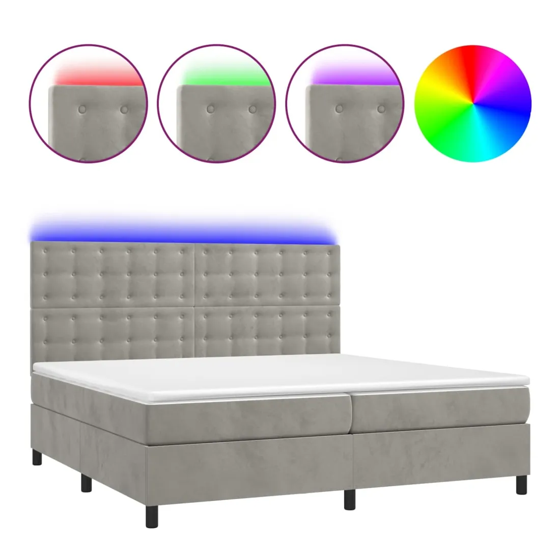 Utilisez ce sommier tapissier avec matelas et LED pour profiter d'un sommeil réparateur ! C'est le point central de votre chambre à coucher. Velours doux : le velours est un tissu doux et luxueux qui se reconnaît à son tas dense de fibres uniformément coupées qui ont une touche lisse. Le tissu en velours présente un toucher doux distinctif, ce qui le rend confortable au toucher.Tête de lit pratique : la tête de lit est réglable en hauteur selon vos préférences. La tête de lit vous offre un excellent soutien du dos lorsque vous êtes assis dans votre lit pour lire ou regarder la télévision.Bande LED colorée : apportez de l'éclairage dans l'obscurité avec des lumières LED colorées !Matelas à ressorts ensachés : le ressort ensaché individuel intégré est connu pour sa très haute qualité tout en assurant un haut niveau de durabilité et d'adaptabilité. Il peut absorber efficacement le bruit et les chocs causés par les sauts et les rotations.Protège-matelas doux pour la peau : le protège-matelas est recouvert d'un tissu résistant et doux pour la peau, ce qui le rend souple et confortable. Remarque :Pour des raisons d'hygiène, le matelas ne peut pas être retourné si l'emballage est retiré ou ouvert.Seule la partie avec un symbole de ciseaux peut être coupée et seule la partie avec l'USB continuera à fonctionner comme avant.Chaque produit est livré avec un manuel de montage dans la boîte pour un montage facile.Ce produit est doté d'un connecteur USB, mais la source d'alimentation certifiée de USB 5V n'est pas incluse.