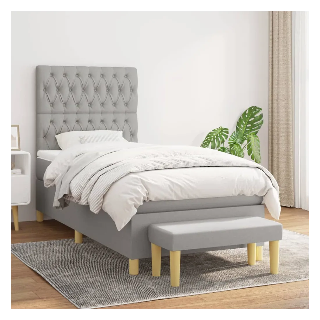 Utilisez ce lit à sommier pour profiter d'une nuit de sommeil réparatrice ! Il vous offre une relaxation maximale et un sommeil agréable. Tissu durable : le tissu présente un aspect simple et épuré, et il est respirant et durable.Tête de lit pratique : la tête de lit est réglable en hauteur selon vos préférences. La tête de lit vous offre un excellent soutien du dos lorsque vous êtes assis dans votre lit pour lire ou regarder la télévision.Matelas à ressorts ensachés : le ressort ensaché individuel intégré est connu pour sa très haute qualité tout en assurant un haut niveau de durabilité et d'adaptabilité. Il peut absorber efficacement le bruit et les chocs causés par les sauts et les rotations.Support moyen-dur : ce matelas de lit offre une stabilité accrue et juste le niveau de fermeté sans sacrifier le confort. Il est donc idéal pour les personnes qui dorment sur le dos ou sur le ventre.Protège-matelas doux pour la peau : le protège-matelas est recouvert d'un tissu résistant et doux pour la peau, ce qui le rend souple et confortable.Banc multifonctionnel : ce banc peut servir de siège supplémentaire dans votre maison. Il peut également être utilisé comme banc de bout de lit. Remarque :Pour des raisons d'hygiène, le matelas ne peut pas être retourné si l'emballage est retiré ou ouvert.Chaque produit est livré avec un manuel de montage dans la boîte pour un montage facile.