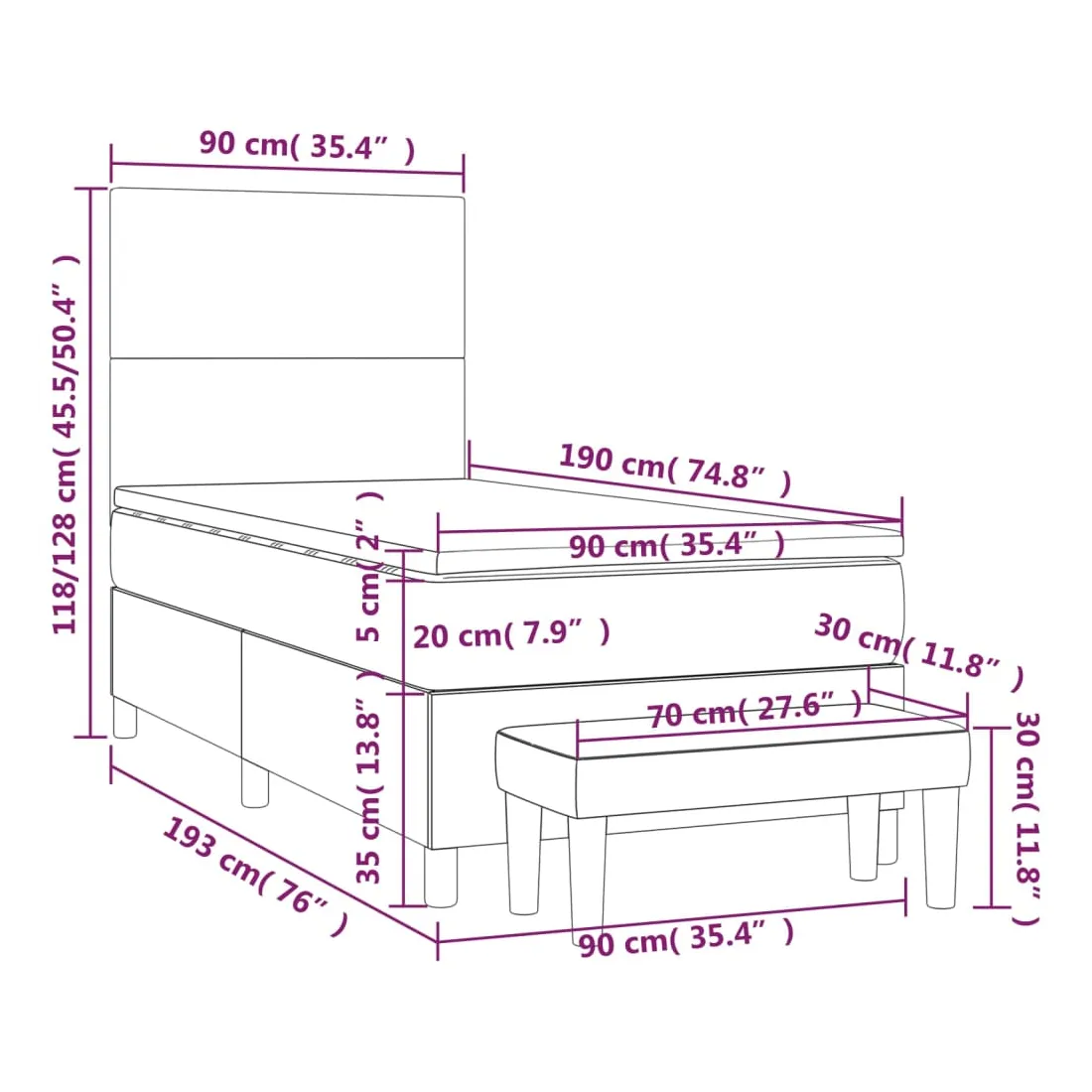 Utilisez ce lit à sommier pour profiter d'une nuit de sommeil réparatrice ! Il vous offre une relaxation maximale et un sommeil agréable. Velours doux : le velours est un tissu doux et luxueux qui se reconnaît à son tas dense de fibres uniformément coupées qui ont une touche lisse. Le tissu en velours présente un toucher doux distinctif, ce qui le rend confortable au toucher.Tête de lit pratique : la tête de lit est réglable en hauteur selon vos préférences. La tête de lit vous offre un excellent soutien du dos lorsque vous êtes assis dans votre lit pour lire ou regarder la télévision.Matelas à ressorts ensachés : le ressort ensaché individuel intégré est connu pour sa très haute qualité tout en assurant un haut niveau de durabilité et d'adaptabilité. Il peut absorber efficacement le bruit et les chocs causés par les sauts et les rotations.Support moyen-dur : ce matelas de lit offre une stabilité accrue et juste le niveau de fermeté sans sacrifier le confort. Il est donc idéal pour les personnes qui dorment sur le dos ou sur le ventre.Protège-matelas doux pour la peau : le protège-matelas est recouvert d'un tissu résistant et doux pour la peau, ce qui le rend souple et confortable.Banc multifonctionnel : ce banc peut servir de siège supplémentaire dans votre maison. Il peut également être utilisé comme banc de bout de lit. Remarque :Pour des raisons d'hygiène, le matelas ne peut pas être retourné si l'emballage est retiré ou ouvert.Chaque produit est livré avec un manuel de montage dans la boîte pour un montage facile.
