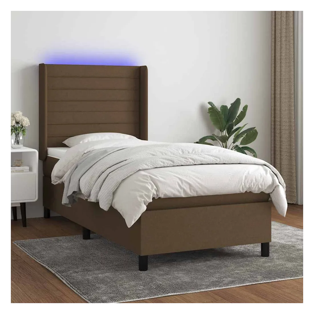 Utilisez ce sommier tapissier avec matelas et LED pour profiter d'un sommeil réparateur ! C'est le point central de votre chambre à coucher. Tissu durable : le tissu présente un aspect simple et épuré, et il est respirant et durable.Tête de lit pratique : la tête de lit est réglable en hauteur selon vos préférences. La tête de lit vous offre un excellent soutien du dos lorsque vous êtes assis dans votre lit pour lire ou regarder la télévision.Bande LED colorée : apportez de l'éclairage dans l'obscurité avec des lumières LED colorées !Matelas à ressorts ensachés : le ressort ensaché individuel intégré est connu pour sa très haute qualité tout en assurant un haut niveau de durabilité et d'adaptabilité. Il peut absorber efficacement le bruit et les chocs causés par les sauts et les rotations.Protège-matelas doux pour la peau : le protège-matelas est recouvert d'un tissu résistant et doux pour la peau, ce qui le rend souple et confortable. Remarque :Pour des raisons d'hygiène, le matelas ne peut pas être retourné si l'emballage est retiré ou ouvert.Seule la partie avec un symbole de ciseaux peut être coupée et seule la partie avec l'USB continuera à fonctionner comme avant.Chaque produit est livré avec un manuel de montage dans la boîte pour un montage facile.Ce produit est doté d'un connecteur USB, mais la source d'alimentation certifiée de USB 5V n'est pas incluse.
