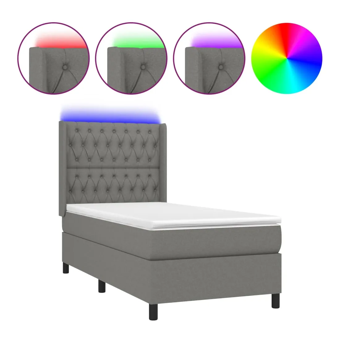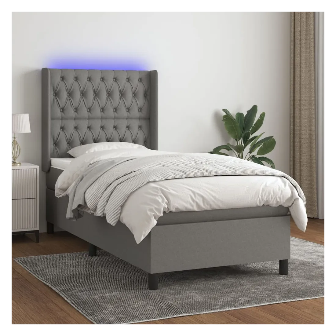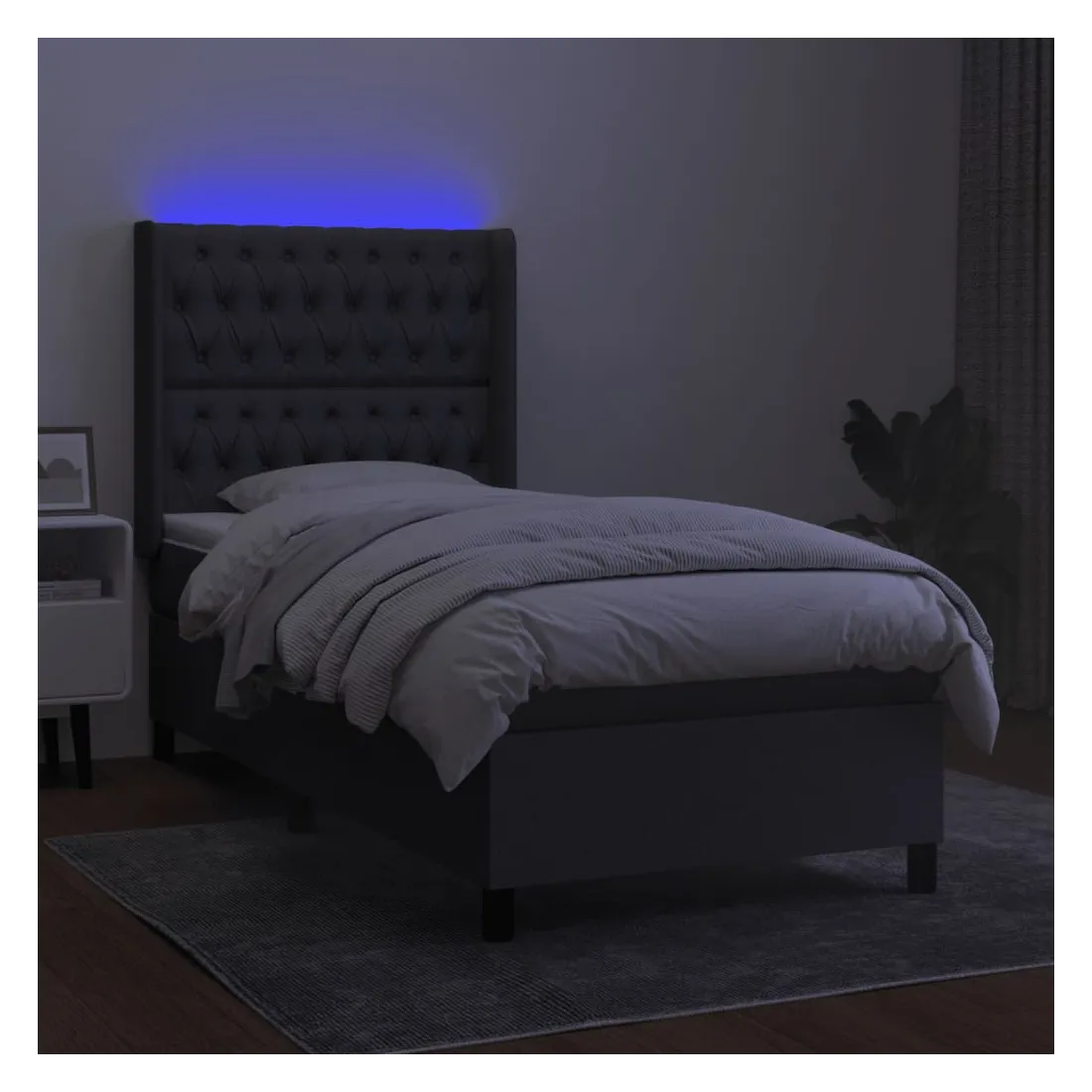 Utilisez ce sommier tapissier avec matelas et LED pour profiter d'un sommeil réparateur ! C'est le point central de votre chambre à coucher. Tissu durable : le tissu présente un aspect simple et épuré, et il est respirant et durable.Tête de lit pratique : la tête de lit est réglable en hauteur selon vos préférences. La tête de lit vous offre un excellent soutien du dos lorsque vous êtes assis dans votre lit pour lire ou regarder la télévision.Bande LED colorée : apportez de l'éclairage dans l'obscurité avec des lumières LED colorées !Matelas à ressorts ensachés : le ressort ensaché individuel intégré est connu pour sa très haute qualité tout en assurant un haut niveau de durabilité et d'adaptabilité. Il peut absorber efficacement le bruit et les chocs causés par les sauts et les rotations.Protège-matelas doux pour la peau : le protège-matelas est recouvert d'un tissu résistant et doux pour la peau, ce qui le rend souple et confortable. Remarque :Pour des raisons d'hygiène, le matelas ne peut pas être retourné si l'emballage est retiré ou ouvert.Seule la partie avec un symbole de ciseaux peut être coupée et seule la partie avec l'USB continuera à fonctionner comme avant.Chaque produit est livré avec un manuel de montage dans la boîte pour un montage facile.Ce produit est doté d'un connecteur USB, mais la source d'alimentation certifiée de USB 5V n'est pas incluse.