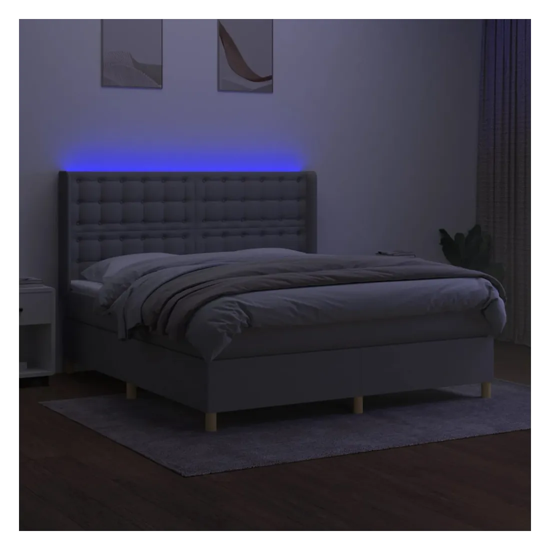 Utilisez ce sommier tapissier avec matelas et LED pour profiter d'un sommeil réparateur ! C'est le point central de votre chambre à coucher. Tissu durable : le tissu présente un aspect simple et épuré, et il est respirant et durable. Tête de lit pratique : la tête de lit est réglable en hauteur selon vos préférences. La tête de lit vous offre un excellent soutien du dos lorsque vous êtes assis dans votre lit pour lire ou regarder la télévision. Bande LED colorée : apportez de l'éclairage dans l'obscurité avec des lumières LED colorées ! Matelas à ressorts ensachés : le ressort ensaché individuel intégré est connu pour sa très haute qualité tout en assurant un haut niveau de durabilité et d'adaptabilité. Il peut absorber efficacement le bruit et les chocs causés par les sauts et les rot