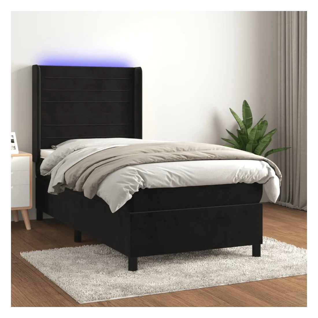 Utilisez ce sommier tapissier avec matelas et LED pour profiter d'un sommeil réparateur ! C'est le point central de votre chambre à coucher. Velours doux : le velours est un tissu doux et luxueux qui se reconnaît à son tas dense de fibres uniformément coupées qui ont une touche lisse. Le tissu en velours présente un toucher doux distinctif, ce qui le rend confortable au toucher.Tête de lit pratique : la tête de lit est réglable en hauteur selon vos préférences. La tête de lit vous offre un excellent soutien du dos lorsque vous êtes assis dans votre lit pour lire ou regarder la télévision.Bande LED colorée : apportez de l'éclairage dans l'obscurité avec des lumières LED colorées !Matelas à ressorts ensachés : le ressort ensaché individuel intégré est connu pour sa très haute qualité tout en assurant un haut niveau de durabilité et d'adaptabilité. Il peut absorber efficacement le bruit et les chocs causés par les sauts et les rotations.Protège-matelas doux pour la peau : le protège-matelas est recouvert d'un tissu résistant et doux pour la peau, ce qui le rend souple et confortable. Remarque :Pour des raisons d'hygiène, le matelas ne peut pas être retourné si l'emballage est retiré ou ouvert.Seule la partie avec un symbole de ciseaux peut être coupée et seule la partie avec l'USB continuera à fonctionner comme avant.Chaque produit est livré avec un manuel de montage dans la boîte pour un montage facile.Ce produit est doté d'un connecteur USB, mais la source d'alimentation certifiée de USB 5V n'est pas incluse.