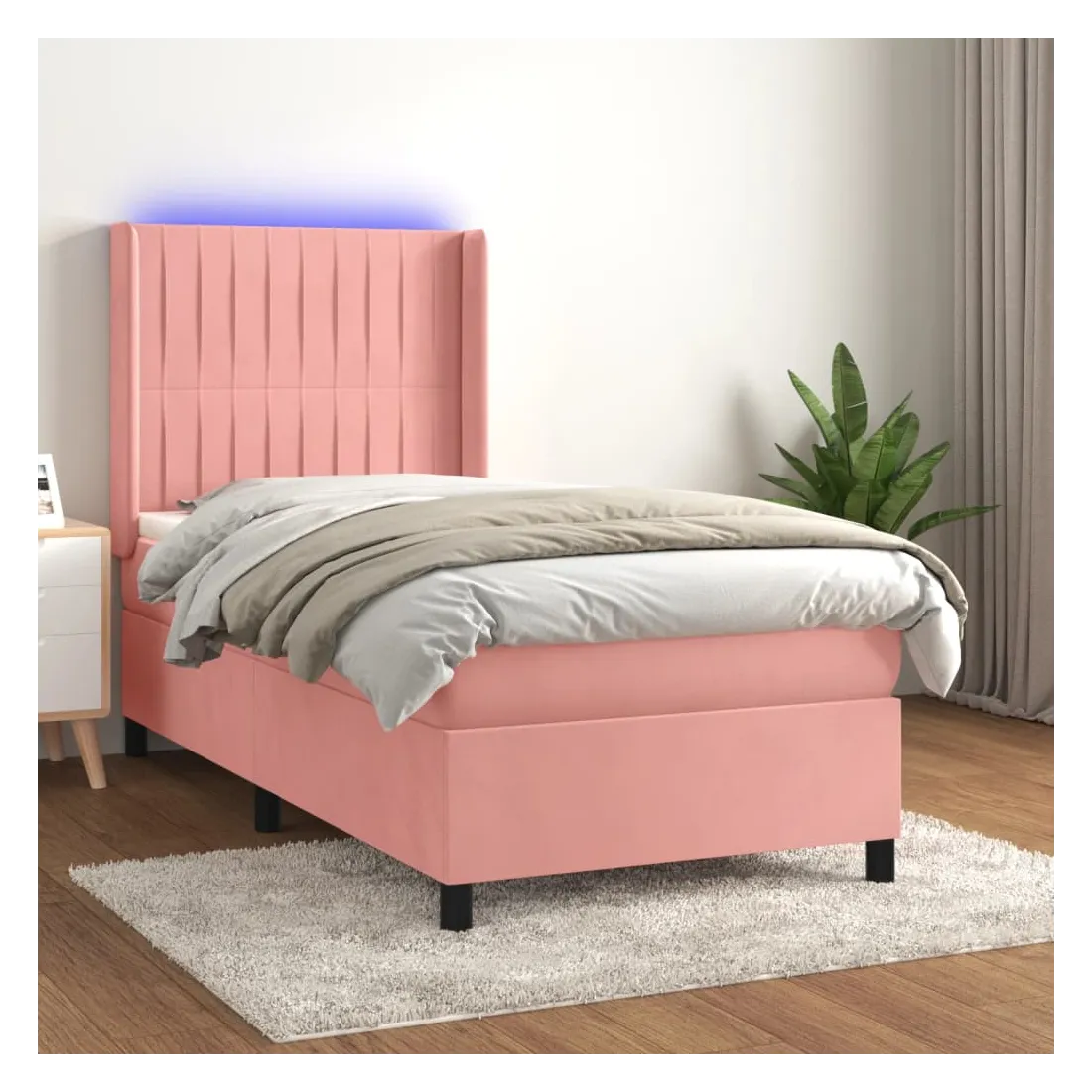 Utilisez ce sommier tapissier avec matelas et LED pour profiter d'un sommeil réparateur ! C'est le point central de votre chambre à coucher. Velours doux : le velours est un tissu doux et luxueux qui se reconnaît à son tas dense de fibres uniformément coupées qui ont une touche lisse. Le tissu en velours présente un toucher doux distinctif, ce qui le rend confortable au toucher.Tête de lit pratique : la tête de lit est réglable en hauteur selon vos préférences. La tête de lit vous offre un excellent soutien du dos lorsque vous êtes assis dans votre lit pour lire ou regarder la télévision.Bande LED colorée : apportez de l'éclairage dans l'obscurité avec des lumières LED colorées !Matelas à ressorts ensachés : le ressort ensaché individuel intégré est connu pour sa très haute qualité tout en assurant un haut niveau de durabilité et d'adaptabilité. Il peut absorber efficacement le bruit et les chocs causés par les sauts et les rotations.Protège-matelas doux pour la peau : le protège-matelas est recouvert d'un tissu résistant et doux pour la peau, ce qui le rend souple et confortable. Remarque :Pour des raisons d'hygiène, le matelas ne peut pas être retourné si l'emballage est retiré ou ouvert.Seule la partie avec un symbole de ciseaux peut être coupée et seule la partie avec l'USB continuera à fonctionner comme avant.Chaque produit est livré avec un manuel de montage dans la boîte pour un montage facile.Ce produit est doté d'un connecteur USB, mais la source d'alimentation certifiée de USB 5V n'est pas incluse.