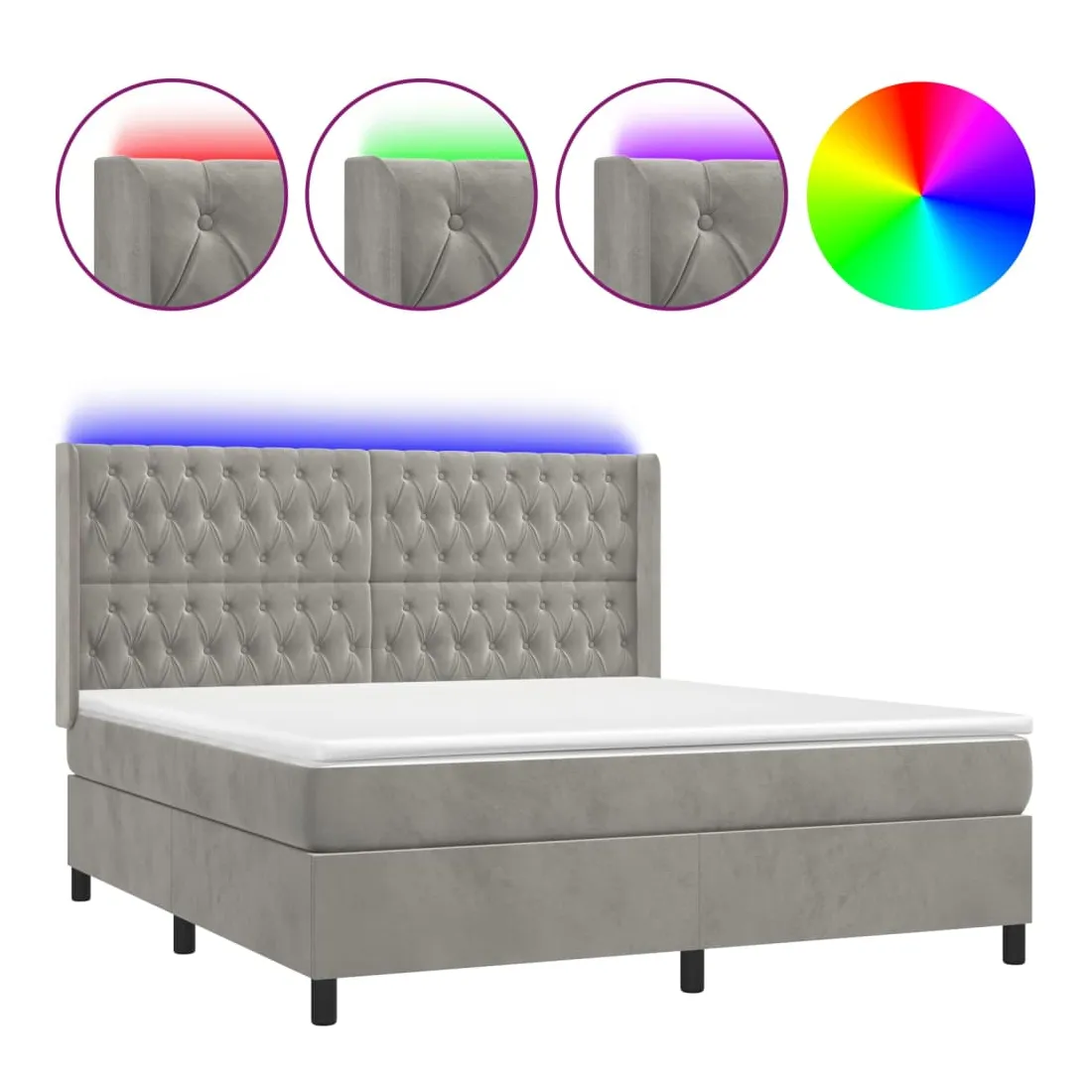 Utilisez ce sommier tapissier avec matelas et LED pour profiter d'un sommeil réparateur ! C'est le point central de votre chambre à coucher. Velours doux : le velours est un tissu doux et luxueux qui se reconnaît à son tas dense de fibres uniformément coupées qui ont une touche lisse. Le tissu en velours présente un toucher doux distinctif, ce qui le rend confortable au toucher.Tête de lit pratique : la tête de lit est réglable en hauteur selon vos préférences. La tête de lit vous offre un excellent soutien du dos lorsque vous êtes assis dans votre lit pour lire ou regarder la télévision.Bande LED colorée : apportez de l'éclairage dans l'obscurité avec des lumières LED colorées !Matelas à ressorts ensachés : le ressort ensaché individuel intégré est connu pour sa très haute qualité tout en assurant un haut niveau de durabilité et d'adaptabilité. Il peut absorber efficacement le bruit et les chocs causés par les sauts et les rotations.Protège-matelas doux pour la peau : le protège-matelas est recouvert d'un tissu résistant et doux pour la peau, ce qui le rend souple et confortable. Remarque :Pour des raisons d'hygiène, le matelas ne peut pas être retourné si l'emballage est retiré ou ouvert.Seule la partie avec un symbole de ciseaux peut être coupée et seule la partie avec l'USB continuera à fonctionner comme avant.Chaque produit est livré avec un manuel de montage dans la boîte pour un montage facile.Ce produit est doté d'un connecteur USB, mais la source d'alimentation certifiée de USB 5V n'est pas incluse.