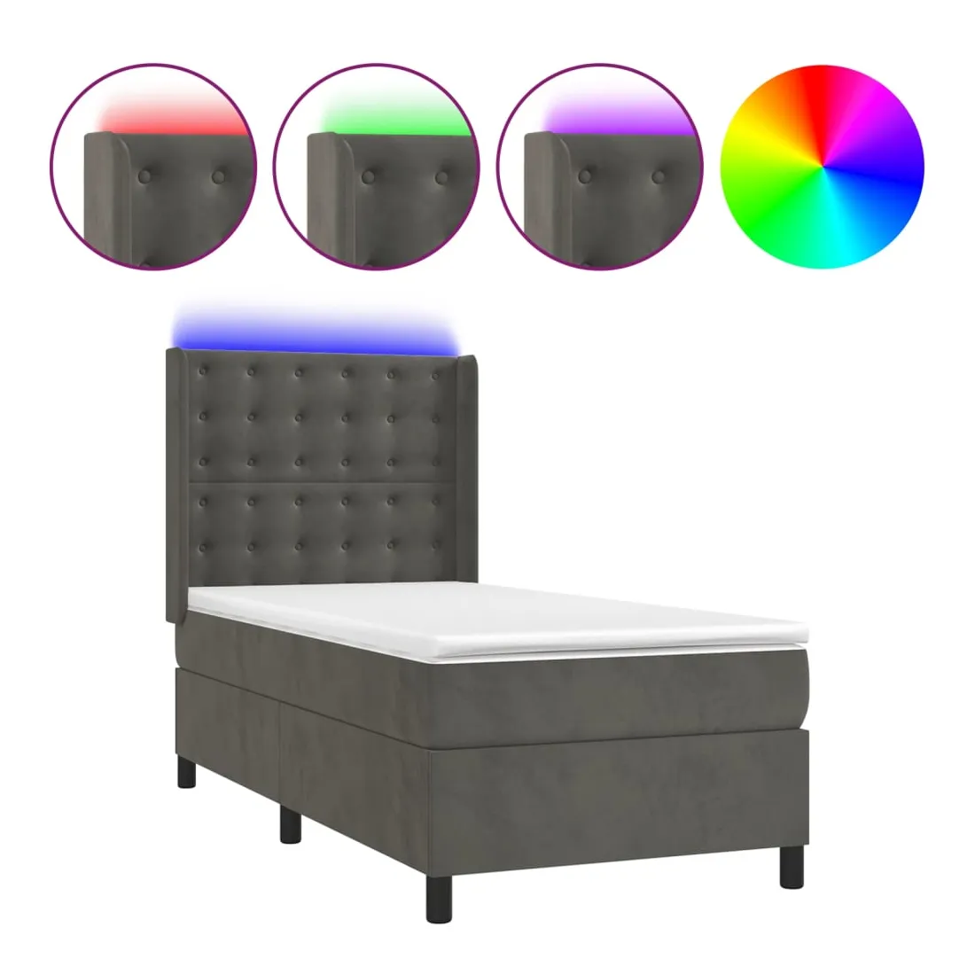 Utilisez ce sommier tapissier avec matelas et LED pour profiter d'un sommeil réparateur ! C'est le point central de votre chambre à coucher. Velours doux : le velours est un tissu doux et luxueux qui se reconnaît à son tas dense de fibres uniformément coupées qui ont une touche lisse. Le tissu en velours présente un toucher doux distinctif, ce qui le rend confortable au toucher.Tête de lit pratique : la tête de lit est réglable en hauteur selon vos préférences. La tête de lit vous offre un excellent soutien du dos lorsque vous êtes assis dans votre lit pour lire ou regarder la télévision.Bande LED colorée : apportez de l'éclairage dans l'obscurité avec des lumières LED colorées !Matelas à ressorts ensachés : le ressort ensaché individuel intégré est connu pour sa très haute qualité tout en assurant un haut niveau de durabilité et d'adaptabilité. Il peut absorber efficacement le bruit et les chocs causés par les sauts et les rotations.Protège-matelas doux pour la peau : le protège-matelas est recouvert d'un tissu résistant et doux pour la peau, ce qui le rend souple et confortable. Remarque :Pour des raisons d'hygiène, le matelas ne peut pas être retourné si l'emballage est retiré ou ouvert.Seule la partie avec un symbole de ciseaux peut être coupée et seule la partie avec l'USB continuera à fonctionner comme avant.Chaque produit est livré avec un manuel de montage dans la boîte pour un montage facile.Ce produit est doté d'un connecteur USB, mais la source d'alimentation certifiée de USB 5V n'est pas incluse.