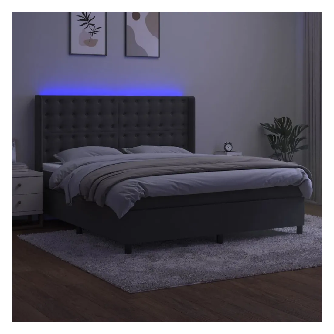 Utilisez ce sommier tapissier avec matelas et LED pour profiter d'un sommeil réparateur ! C'est le point central de votre chambre à coucher. Velours doux : le velours est un tissu doux et luxueux qui se reconnaît à son tas dense de fibres uniformément coupées qui ont une touche lisse. Le tissu en velours présente un toucher doux distinctif, ce qui le rend confortable au toucher.Tête de lit pratique : la tête de lit est réglable en hauteur selon vos préférences. La tête de lit vous offre un excellent soutien du dos lorsque vous êtes assis dans votre lit pour lire ou regarder la télévision.Bande LED colorée : apportez de l'éclairage dans l'obscurité avec des lumières LED colorées !Matelas à ressorts ensachés : le ressort ensaché individuel intégré est connu pour sa très haute qualité tout en assurant un haut niveau de durabilité et d'adaptabilité. Il peut absorber efficacement le bruit et les chocs causés par les sauts et les rotations.Protège-matelas doux pour la peau : le protège-matelas est recouvert d'un tissu résistant et doux pour la peau, ce qui le rend souple et confortable. Remarque :Pour des raisons d'hygiène, le matelas ne peut pas être retourné si l'emballage est retiré ou ouvert.Seule la partie avec un symbole de ciseaux peut être coupée et seule la partie avec l'USB continuera à fonctionner comme avant.Chaque produit est livré avec un manuel de montage dans la boîte pour un montage facile.Ce produit est doté d'un connecteur USB, mais la source d'alimentation certifiée de USB 5V n'est pas incluse.