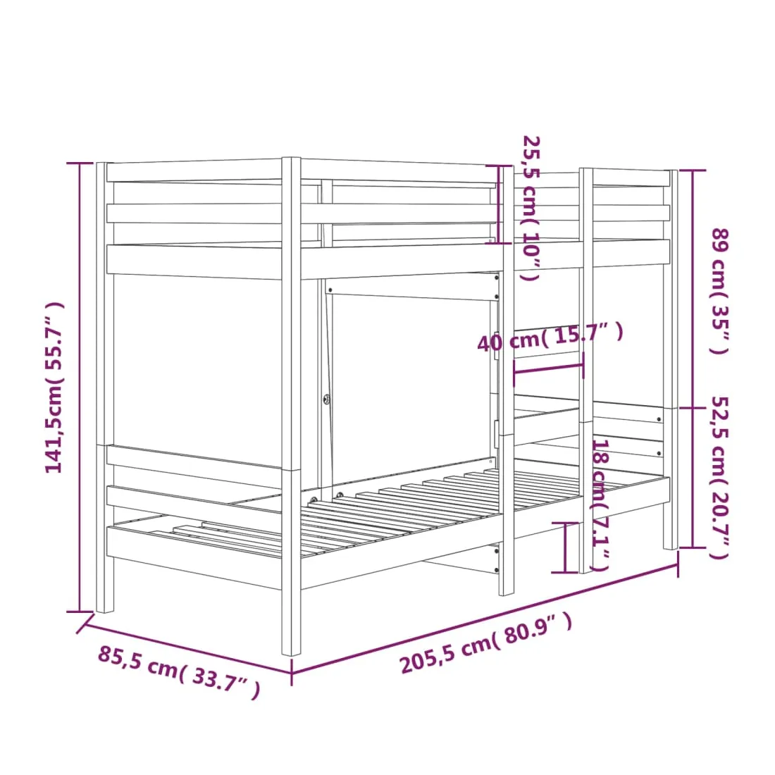 Ce lit superposé en bois est élégant et fonctionnel, ce qui en fait un supplément parfait à toute pièce dont l'espace est limité. Bois de pin massif : le bois de pin massif est un matériau naturel magnifique. Le bois de pin a un grain droit et les nœuds donnent au matériau son aspect caractéristique et rustique. Design sûr : le lit surélevé est conçu dans un souci de sécurité. Il comprend des garde-corps qui empêchent l'utilisateur de rouler pendant son sommeil. Convient aux espaces limités : le lit superposé en bois massif est un excellent choix pour toute pièce dont l'espace est limité. Il fournit deux lits individuels avec un design compact. Remarque : La livraison comprend uniquement les cadres de lit. Les matelas ne sont pas inclus. Vous pouvez consulter notre boutique pour trouve