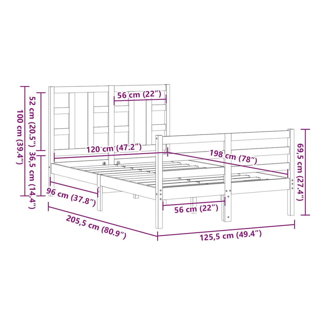 - Dimensions totales du lit : 205,5 x 125,5 x 100 cm (L x l x H)